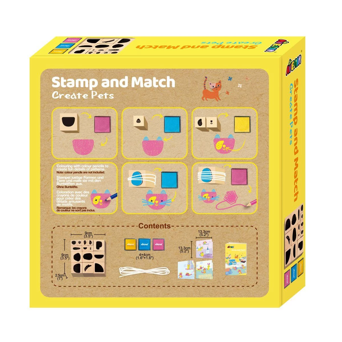 Let kids explore creativity with the Avenir Wooden Stamp Craft Kit! Includes 3 printed cards, 14 beech wood stamps & instructions to design fantasy creatures, greeting cards & more. A fun, hands-on way to develop creativity & logic. For ages 3-5 Years.