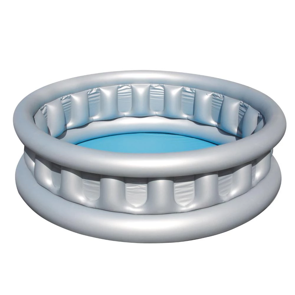 Blast off into summer fun with the Bestway Space Ship Pool (152x43cm)! This uniquely designed inflatable kids' pool is shaped like a silver flying saucer, bringing an out-of-this-world experience to your backyard. The sturdy pre-tested vinyl ensures durability, while the three air chambers make for quick and easy inflation. With a water capacity of 512L (135 gal.), kids can splash, play, and cool off under the sun, creating endless summer memories. The padded exterior liner adds an extra layer of comfort, making this space-themed pool perfect for young adventurers!