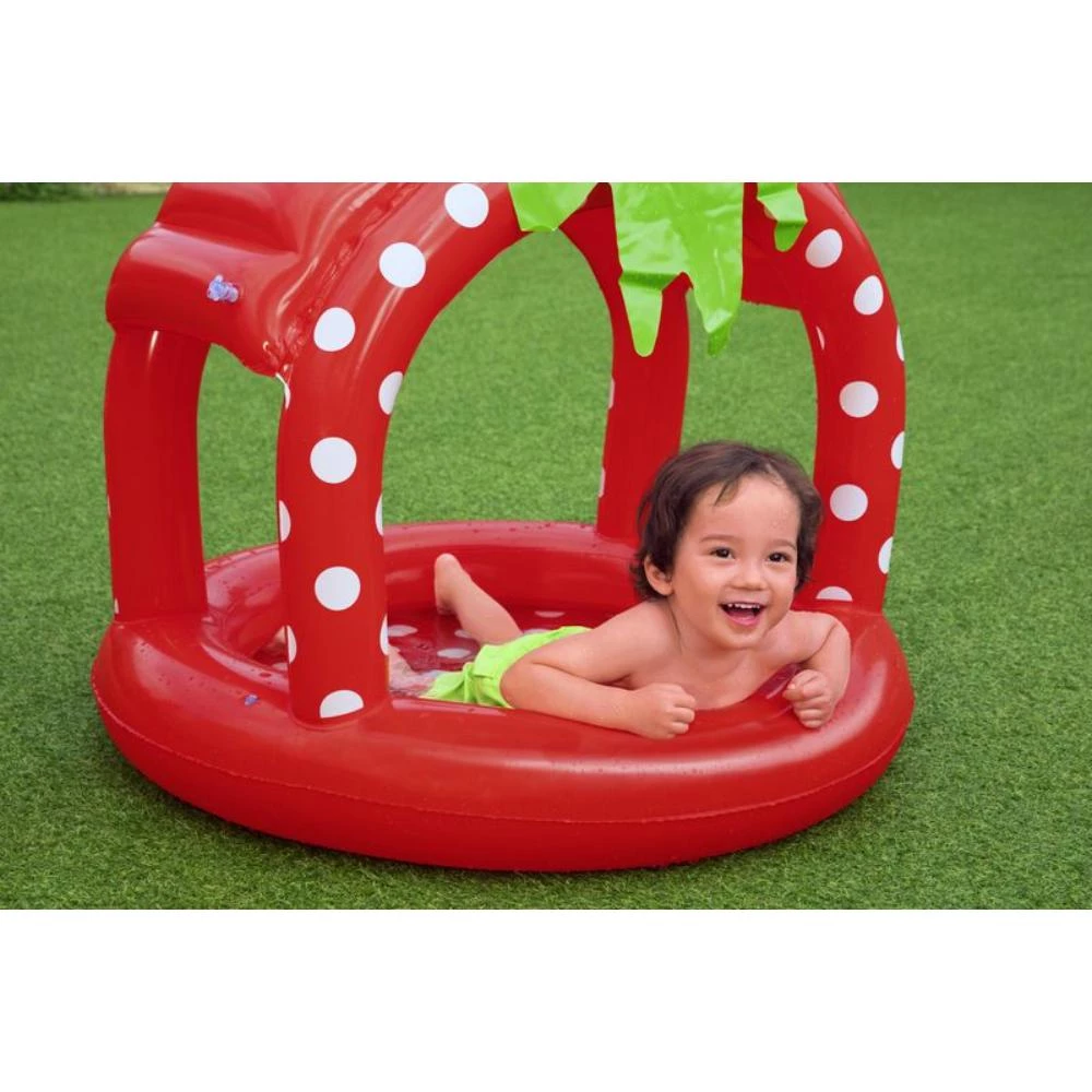 The Bestway® Very Berry Inflatable Baby Pool is the perfect way to introduce little ones to water play in a safe and fun environment. With adorable strawberry graphics and a built-in UV Careful™ sunshade, this 91 cm x 91 cm x 91 cm pool helps protect your child from harmful UV rays while they splash and play. Designed for kids aged 2+, this easy-to-set-up pool provides 26 liters (7 gallons) of water capacity for endless summer fun. Whether in the backyard or at the beach, the Very Berry Baby Pool offers safe, shaded, and refreshing water play all season long!