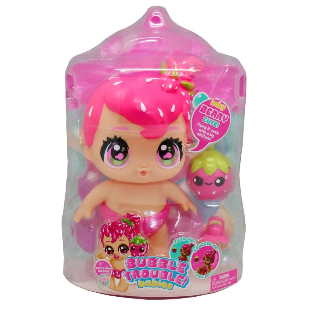 Discover the adorable world of Bubble Trouble Babies Series 1, where gumballs come to life as soft, scented dolls! These 9-inch interactive baby dolls are squishy, squeezable, and perfect for fun-filled playtime. Each Bubble Trouble Baby comes with a bottle and pacifier, ready for feeding. Fill the bottle, feed your baby, and give their belly a gentle squeeze to watch them cheekily spit water!