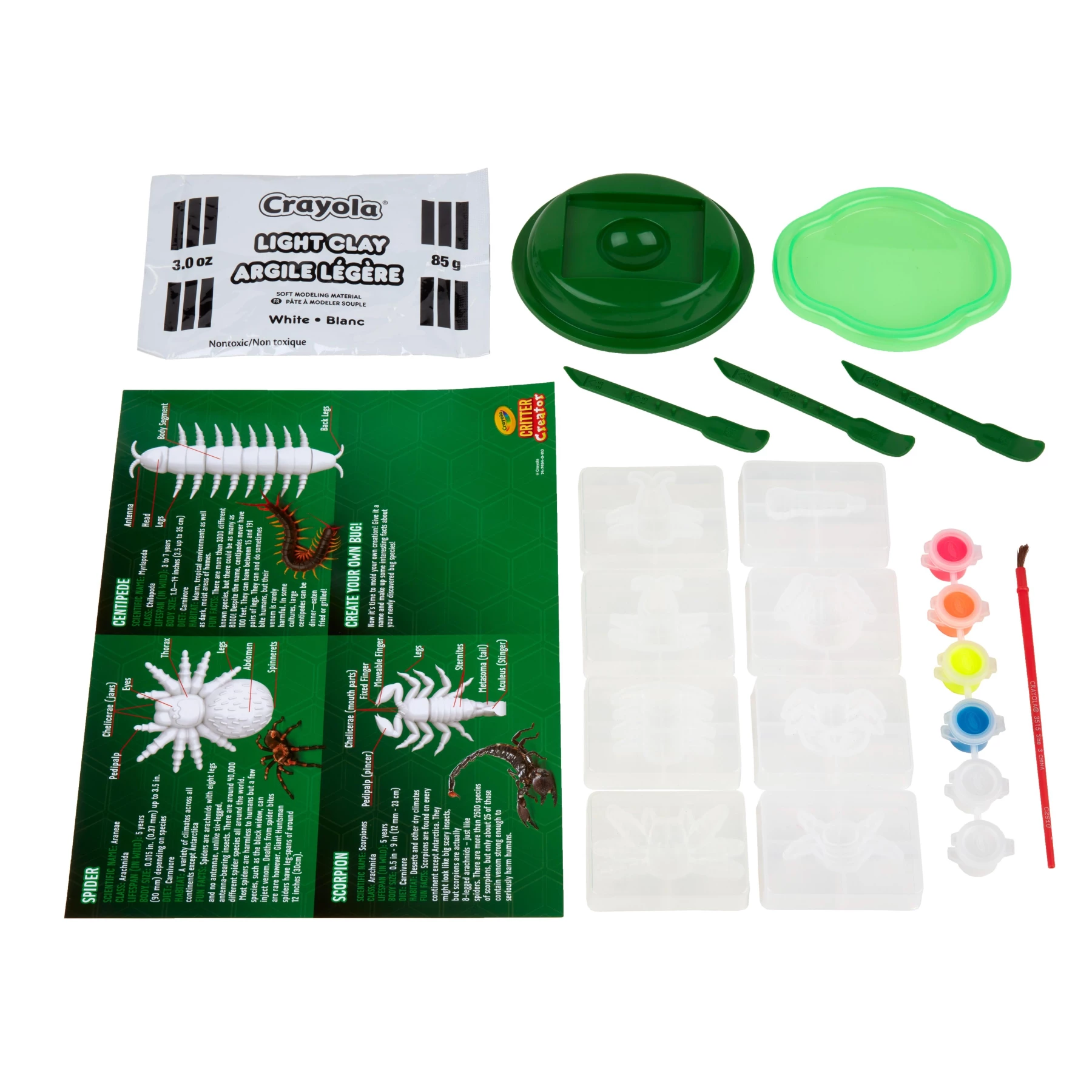 Get ready for hours of creative fun with the Crayola Critter Creator Glow Bugs Kit! Perfect for kids who love creepy-crawlers, this build-a-bug art set allows children to use modeling clay and 8 molds to create detailed scorpions, spiders, and centipedes. For added creativity, kids can mix and match bug body parts to design their own unique bugs! The kit also features specialty glow paint, making creations glow in the dark for an extra element of fun. This craft set helps kids exercise their STEAM skills while boosting confidence and creativity. The included playmat, bug FAQs, and bug stands allow kids to show off their glowing gnat-sterpieces!