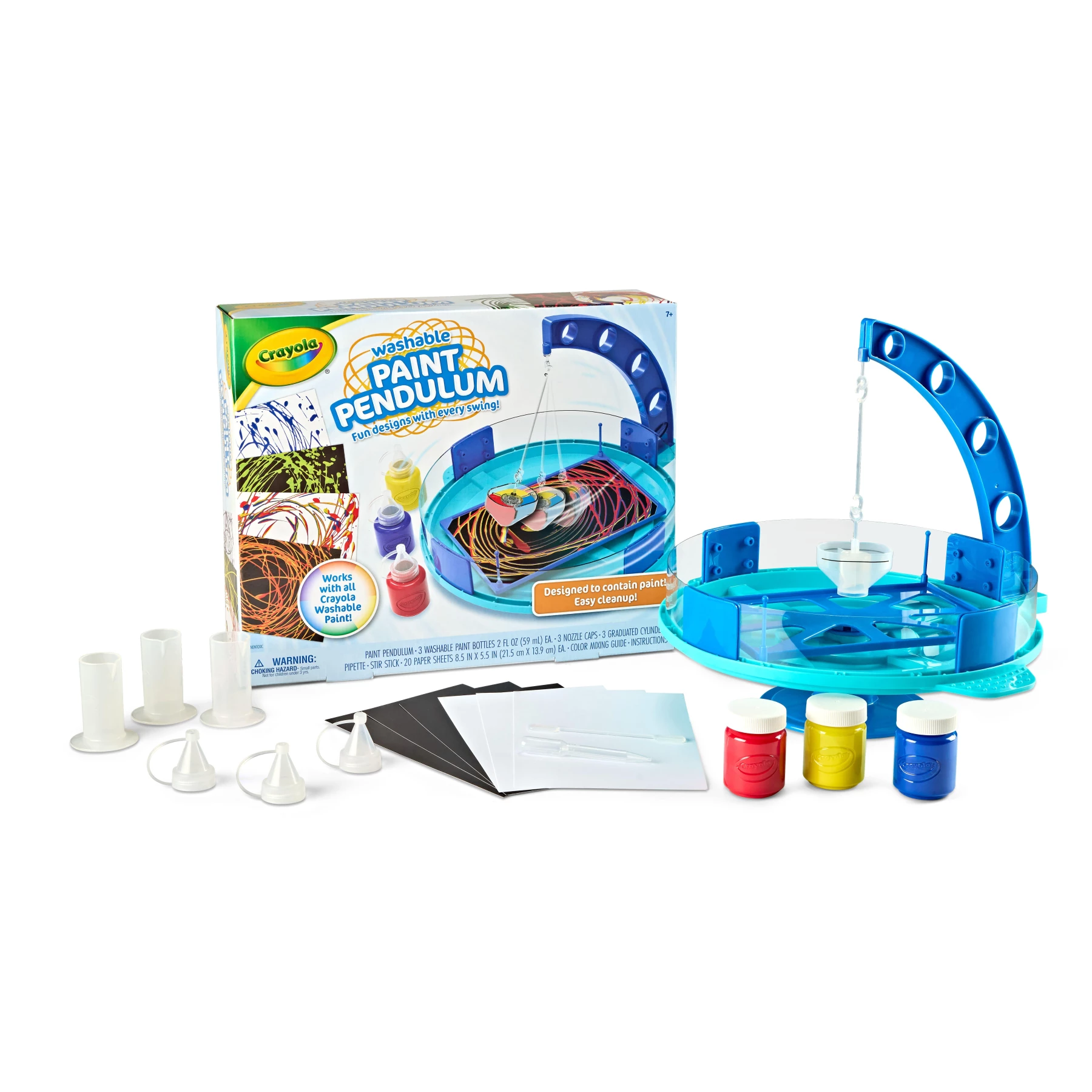 Let your child dive into the world of art and creativity with the Crayola Paint Pendulum Kit! This fun and innovative kit allows kids to create mesmerizing geometric patterns on paper by simply filling the pendulum with paint and releasing it. The kit includes 3 washable paint bottles (Red, Blue, Yellow), 10 white and 10 black paper sheets, 3 nozzle caps, 1 beaker, 1 pipette, and a color mixing guide to inspire new shades. The arena-style design minimizes mess, making cleanup easy with just water. Ideal for kids aged 7 and up, this kit encourages hands-on learning and creative exploration. Once supplies run out, refill with Crayola Construction Paper and Crayola Washable Paint for endless fun!
