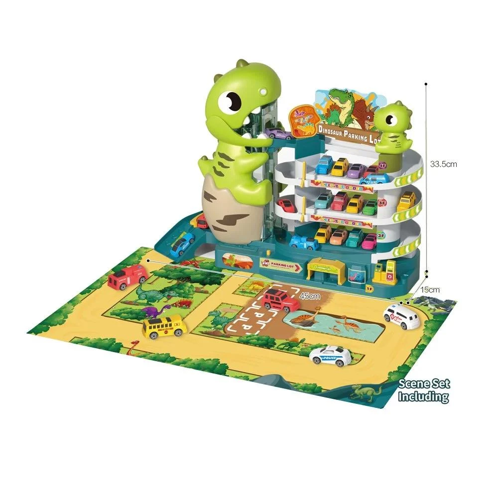 dinosaur parking lot toy, interactive car track set, dinosaur toy for kids age 3+, STEM dinosaur playset, motorized dino garage, toy car ramp track, dino world garage, educational car playset, dinosaur elevator toy, boys dinosaur toy gift