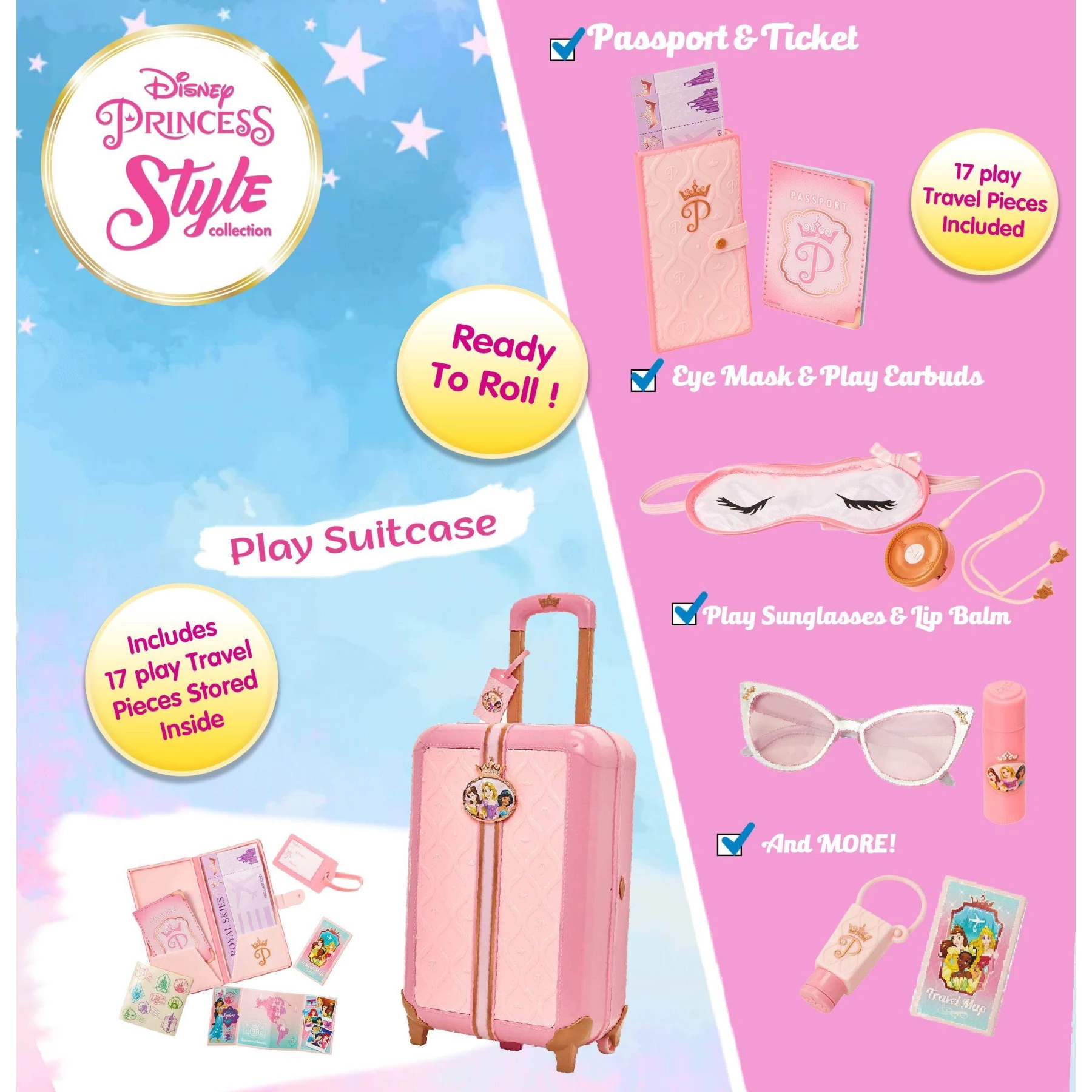 Jet off to magical adventures with the Disney Princess Style Suitcase Travel Set! This 17-piece playset includes everything a young traveler needs to explore in style-from a play passport and airplane ticket to earbuds, an eye mask, lip balm, and hand sanitizer. The real working wheels and retractable handle make it feel just like a real suitcase, adding to the fun of pretend travel. Perfect for role-play, imaginative adventures, and Disney Princess fans, this set lets kids experience the excitement of travel in a fun and stylish way!