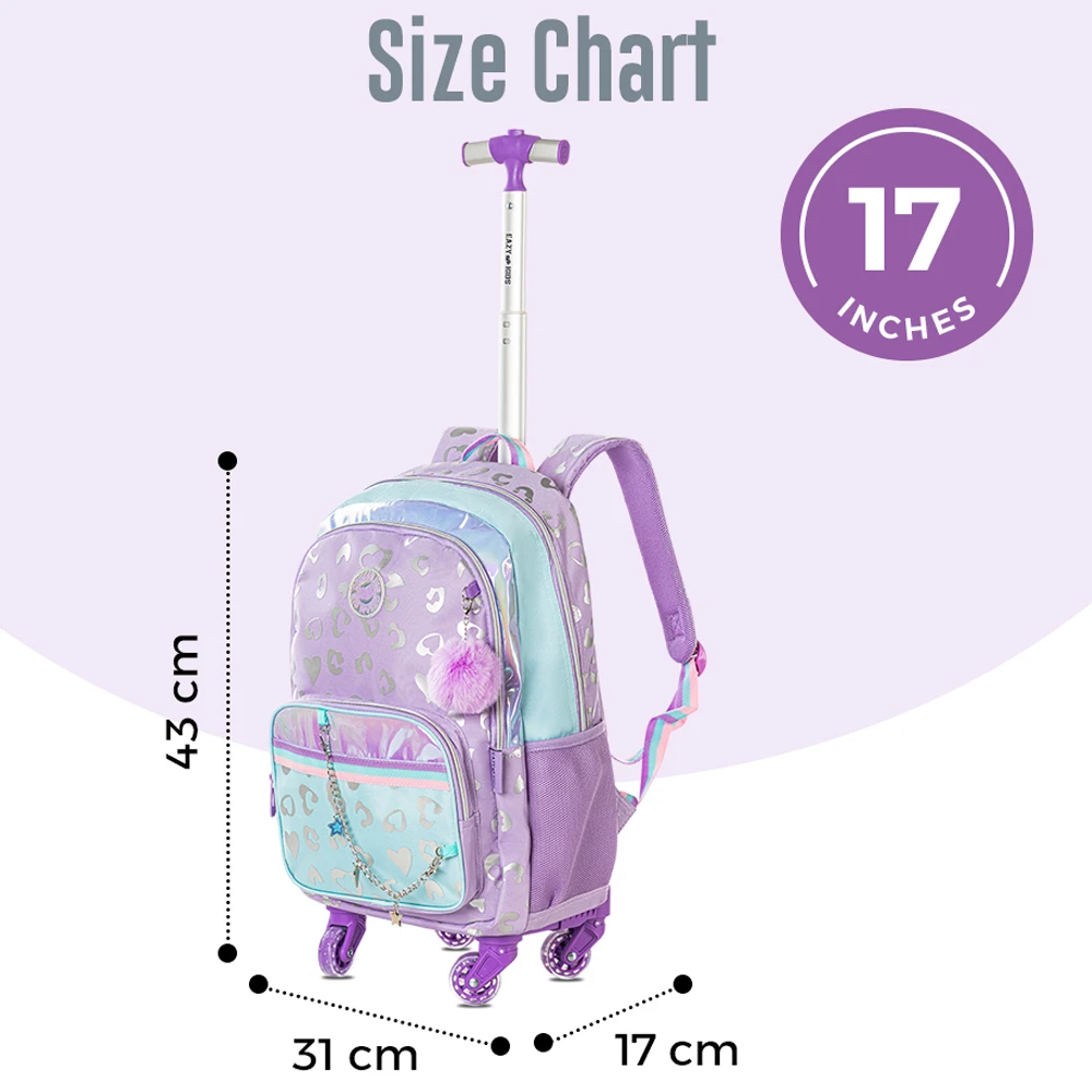 Travel to school with ease using the Eazy Kids Love Purple 3-Piece 4-Wheel Trolley School Bag Set. This spacious 17-inch trolley backpack comes with a smooth 4-wheel rolling system, making it easy to maneuver even when fully loaded. The main compartment offers plenty of room for books and supplies, while the front pockets keep smaller items organized.