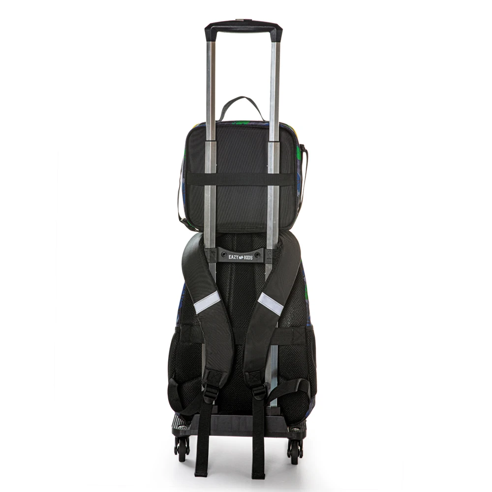 The Eazy Kids 17" 4-Piece 4-Wheel Trolley School Backpack Set - T-Rex Theme brings prehistoric excitement to school time. Featuring a bold T-Rex design, this set includes a spacious backpack, a matching lunch bag, a pencil case, and an extra accessory pouch. The large compartments and multiple pockets provide organized storage for books, stationery, and snacks.