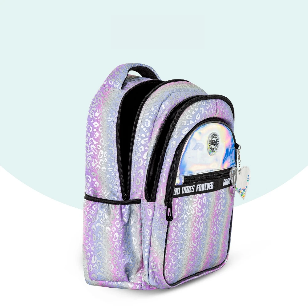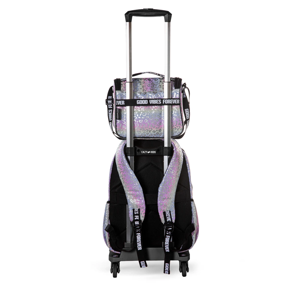 eazy kids school bag,girls trolley school bag,silver school backpack,good vibes design,kids school set with lunch bag,kids pencil case combo,17 inch school bag,kids stylish school bag,4-wheel trolley backpack,fashionable school bag for kids,kids water resistant bag,kids lunch bag set,girls back to school set,kids durable backpack,kids ergonomic school bag,trendy kids school gear,kids travel school bag,school bag with matching accessories,kids bag with positive quotes