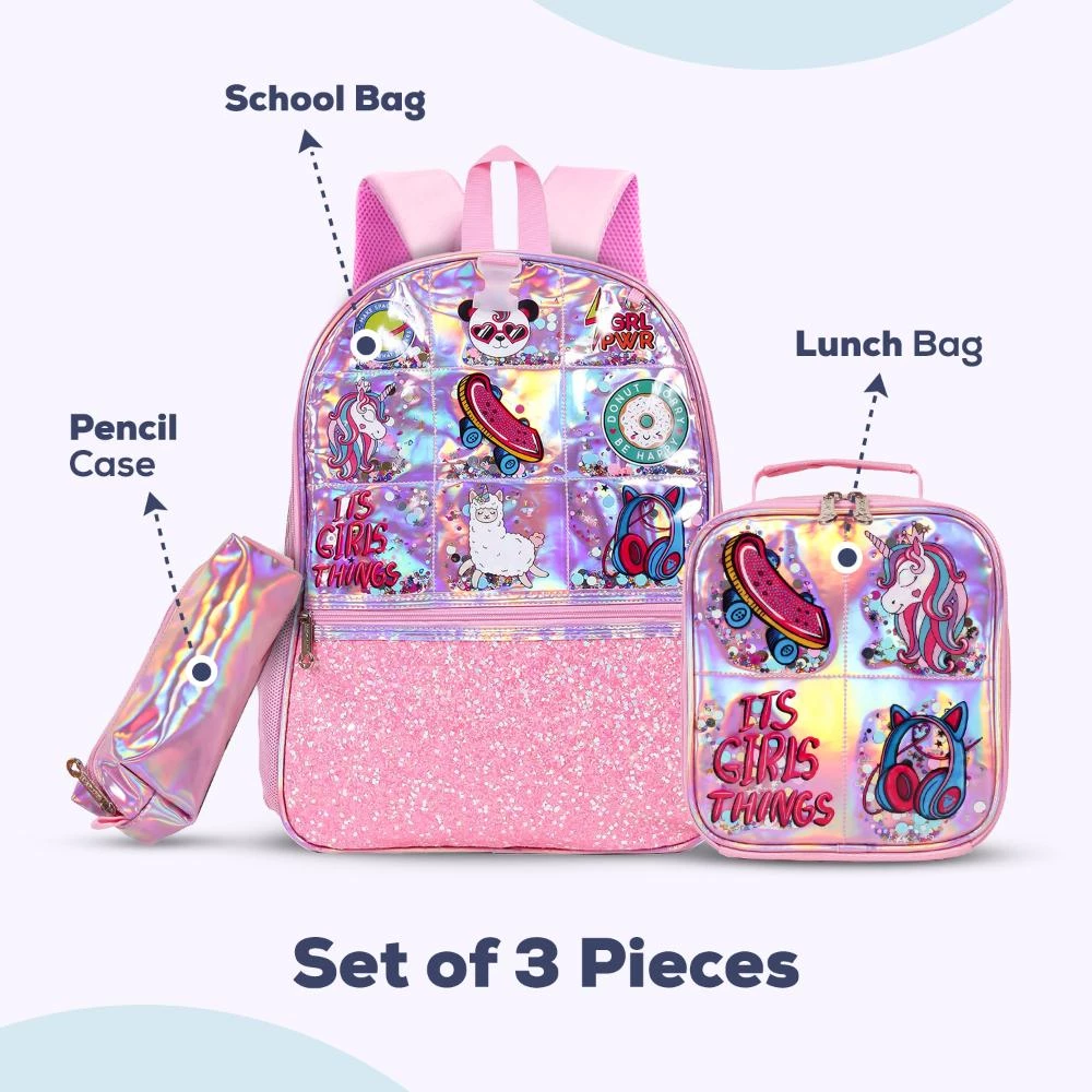 Eazy Kids - 17" School Bag, Lunch Bag & Pencil Case Set of 3 - Girl Things - Pink