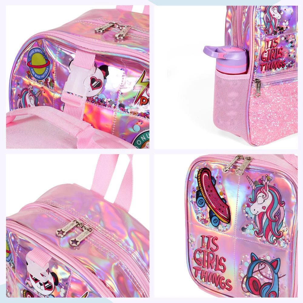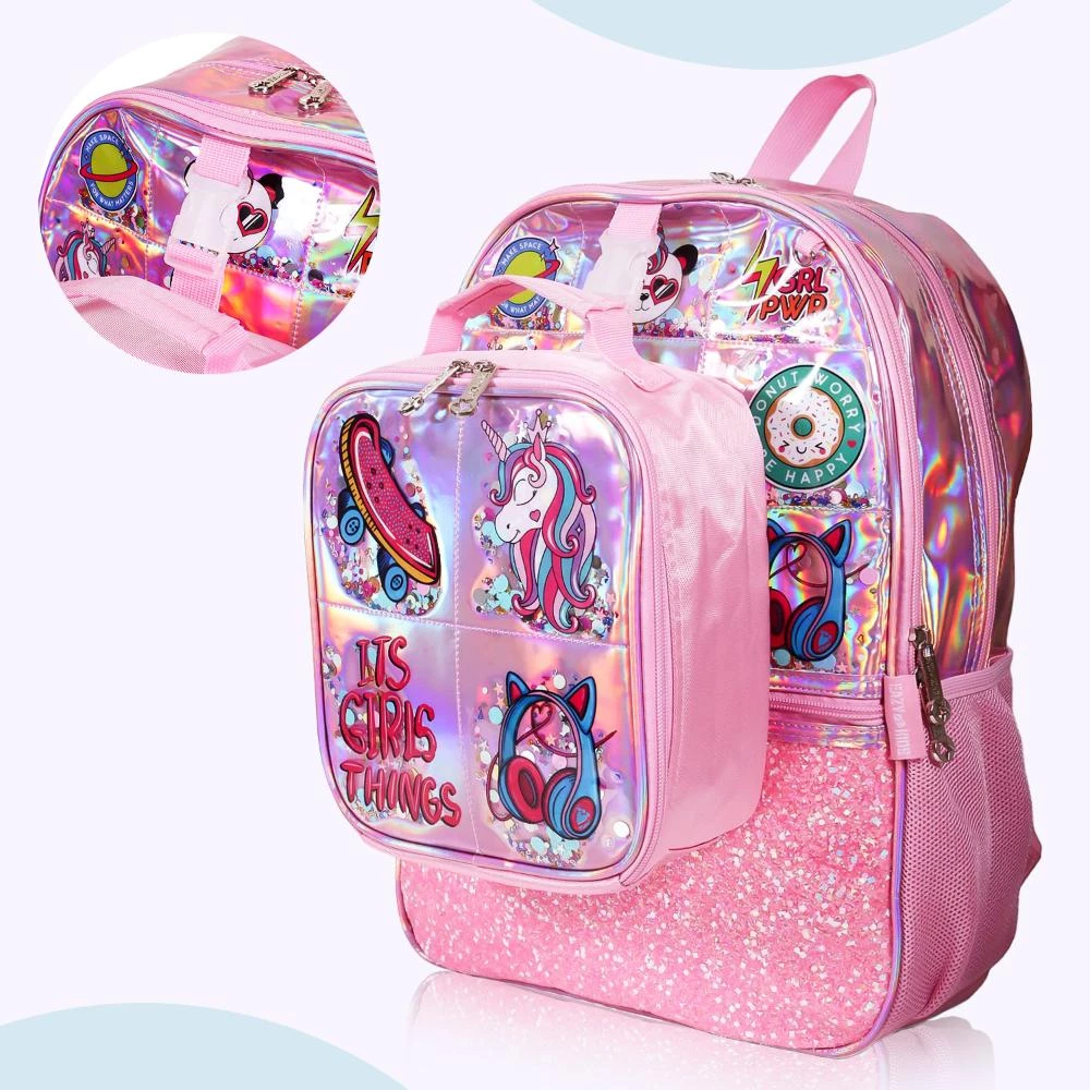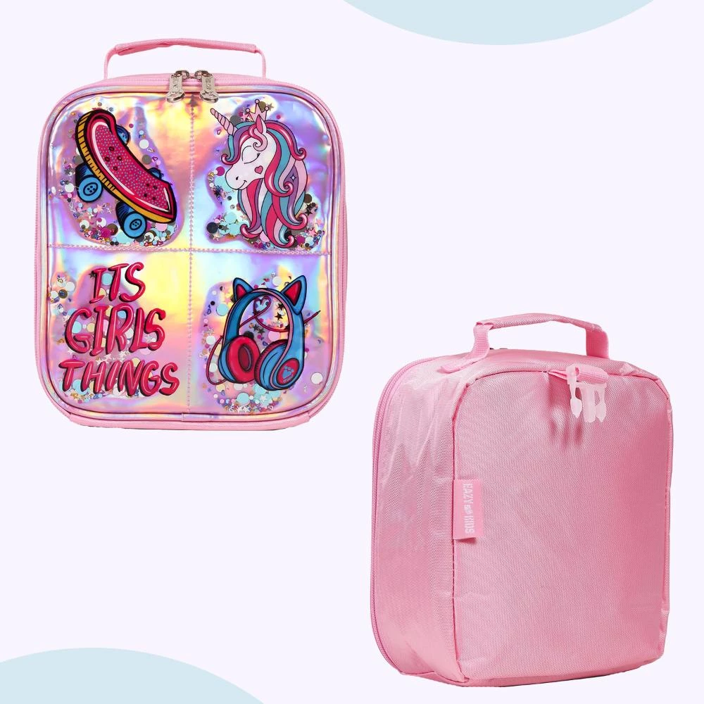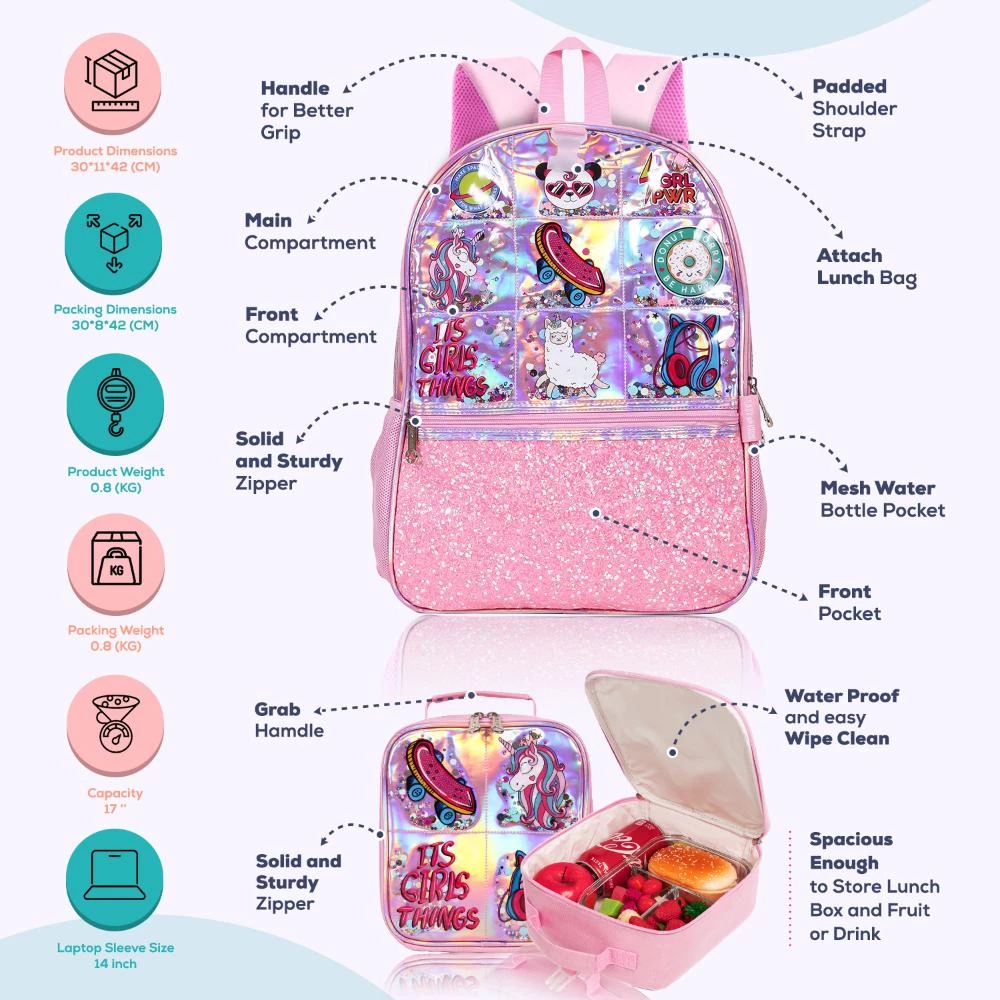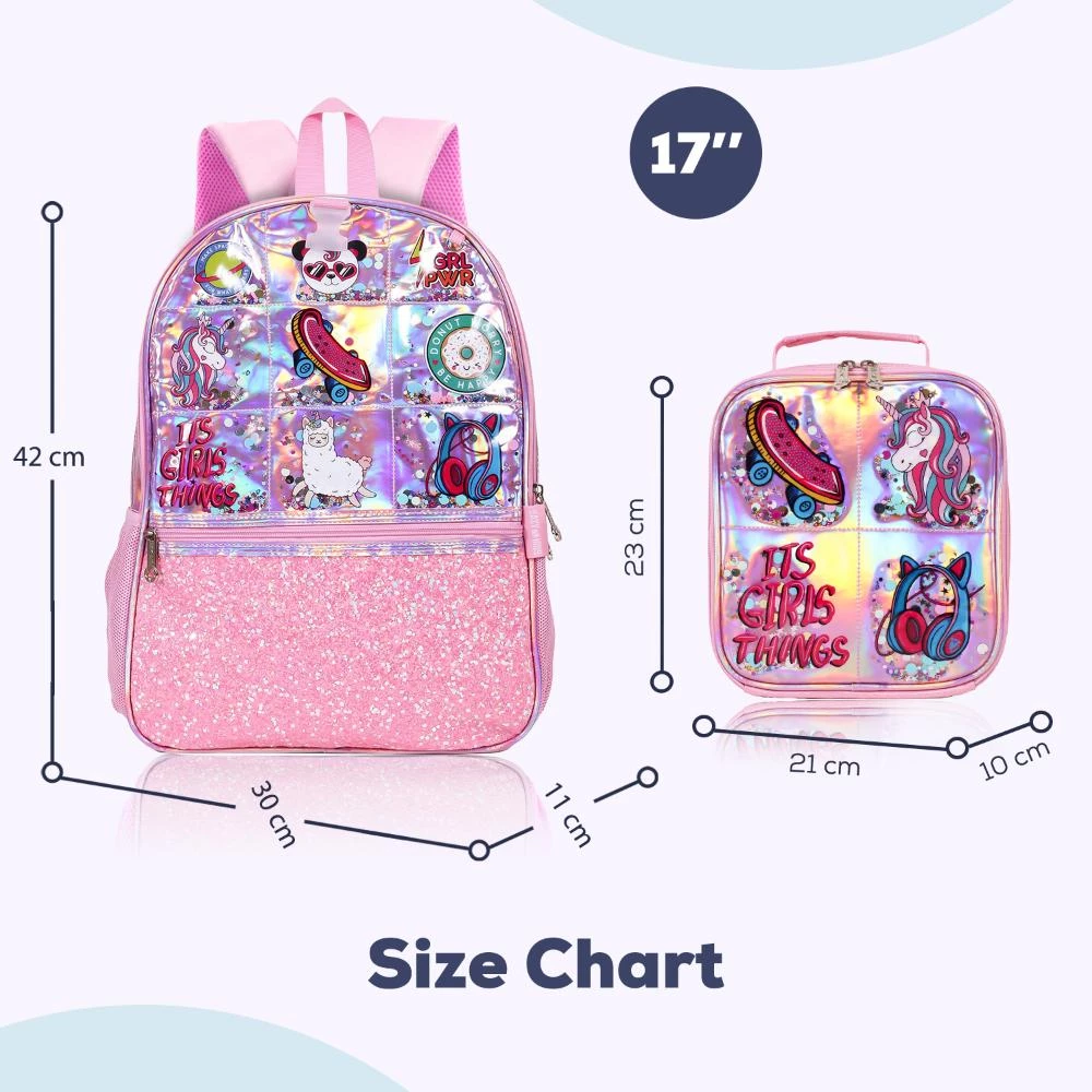 Brighten up the school routine with the Eazy Kids Girl Things 3-piece backpack set in a playful pink unicorn theme. This complete set includes a 17" backpack, insulated lunch bag, and a pencil caseall crafted from durable, water-resistant polyester for lasting everyday use. The backpack provides ample space and compartmentalized storage for school essentials, while the easy-access front pockets and sturdy zippers ensure practical use. Designed with comfort in mind, the padded shoulder straps are wide and breathable, and the back features a strap to attach the bag to a trolley when needed. The matching lunch bag helps maintain food freshness, and the coordinating pencil case keeps supplies organized and easy to find. Perfect for everyday adventures, school, or short trips, this set makes a thoughtful and functional gift for any child who loves bright, whimsical designs.