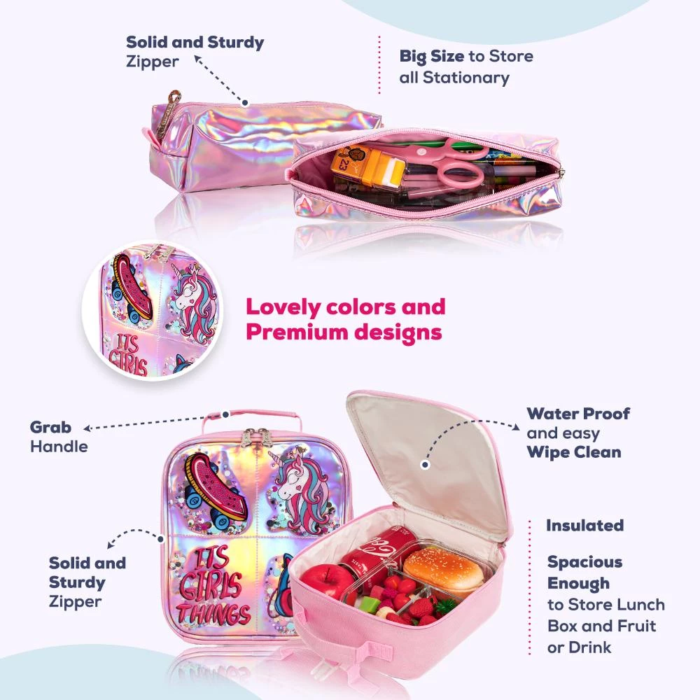 unicorn backpack set, pink school bag combo, girls school bag set, insulated lunch bag for kids, waterproof school backpack, stylish kids backpack, back to school essentials, pencil pouch set, Eazy Kids girl set, pink unicorn school bag