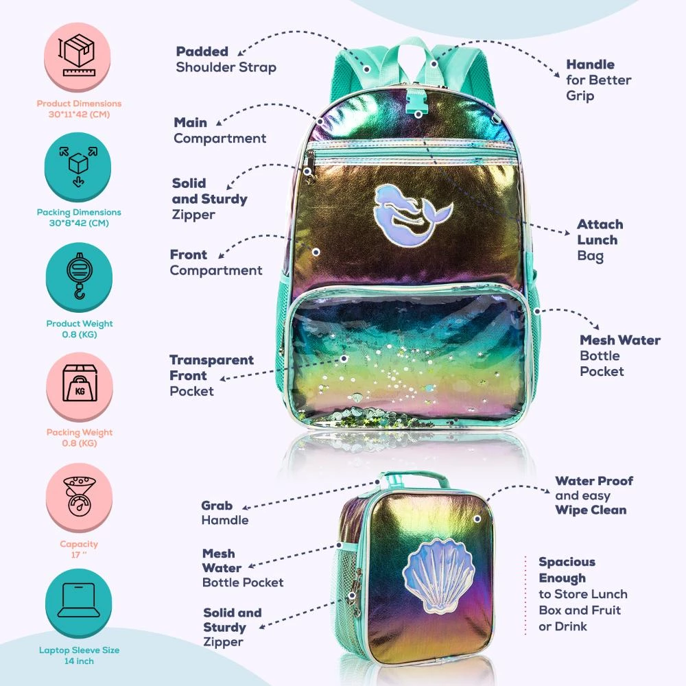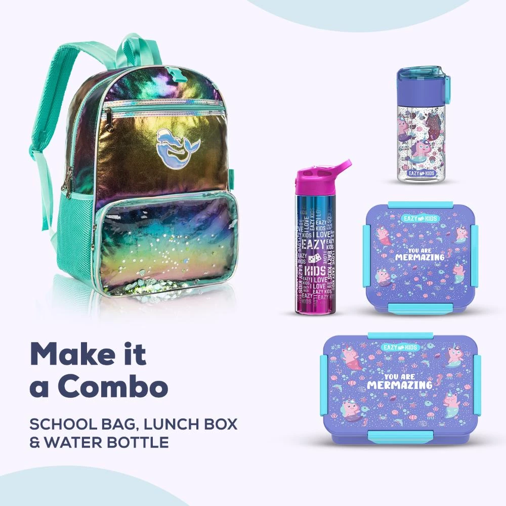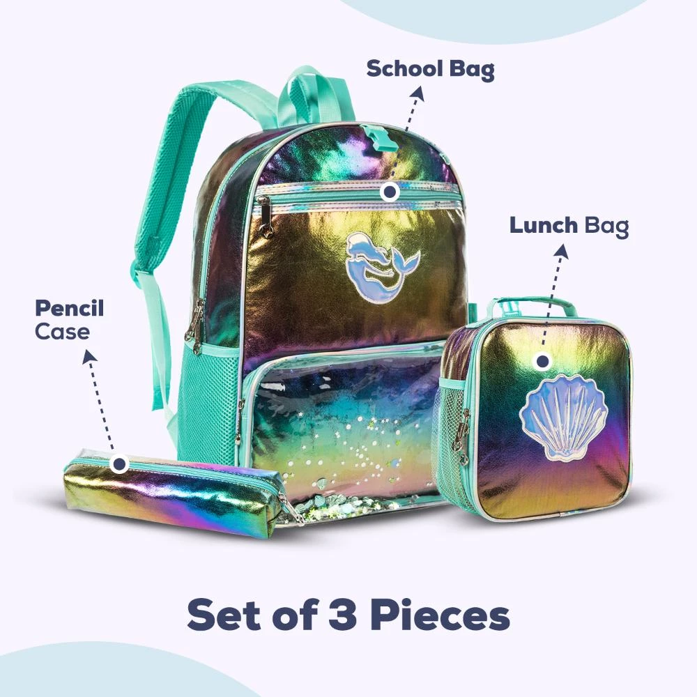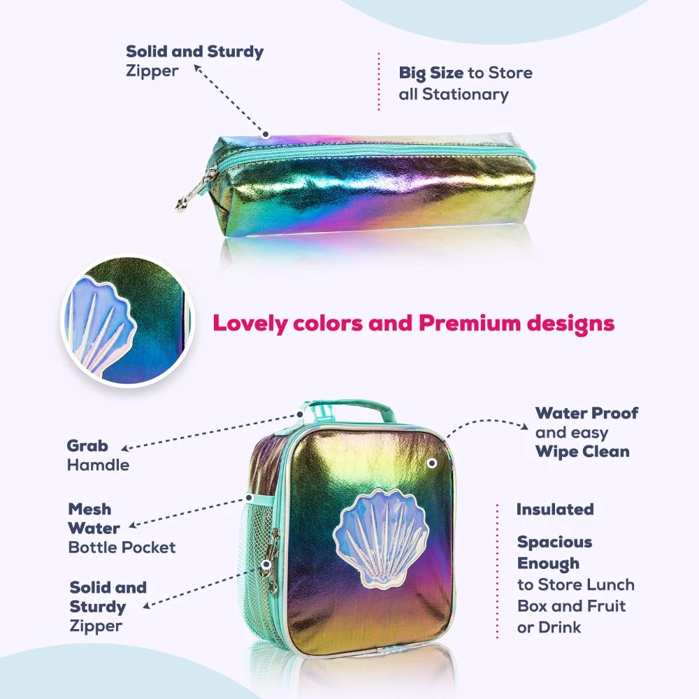mermaid shell backpack, girls school bag green, insulated lunch bag set, stylish school bags, waterproof backpack set, Eazy Kids bag combo, pencil pouch with backpack, back to school gift, kids travel bag set, seagreen school set