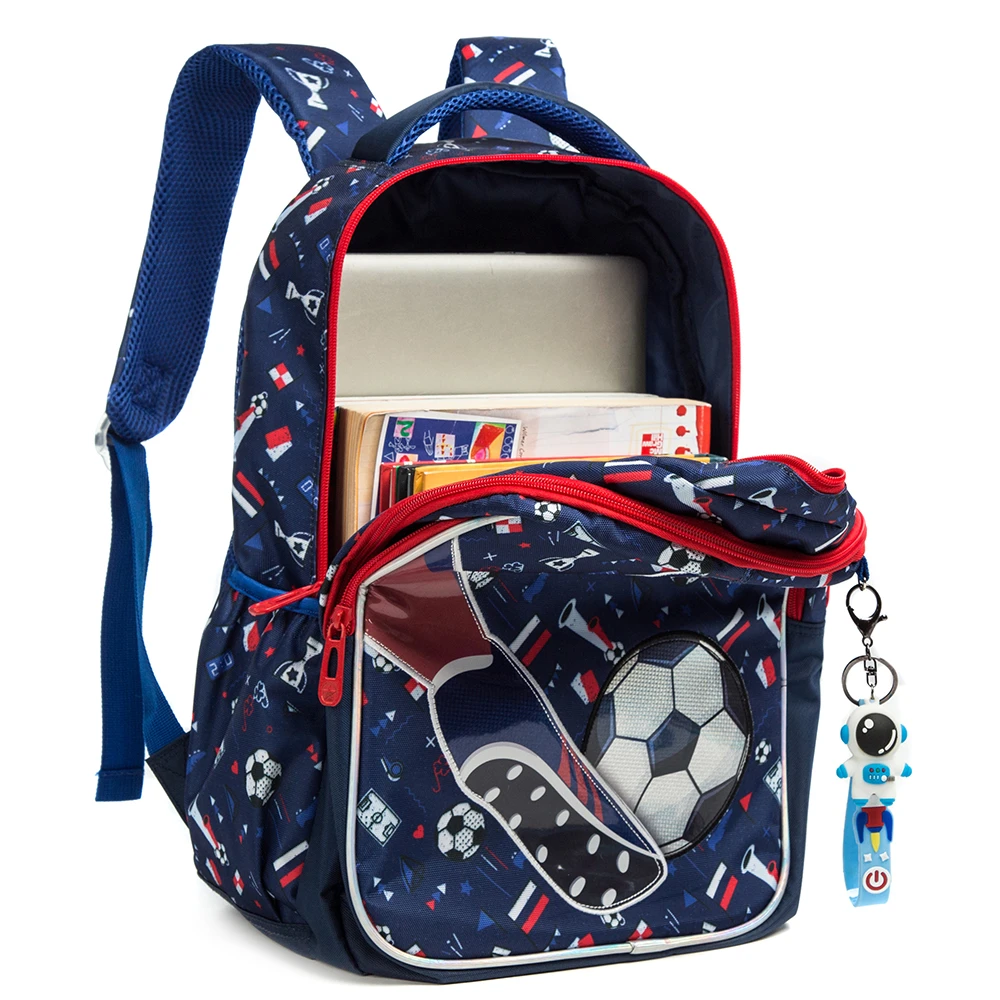 football theme, blue school set, trolley backpack set, insulated lunch bag, pencil case included, sporty design, water-resistant fabric, dirt proof exterior, school storage solution, ergonomic straps, matching school set, novelty school gear, practical school combo, easy clean set, reliable school kit, organized compartments, vibrant design set, eazy kids school set