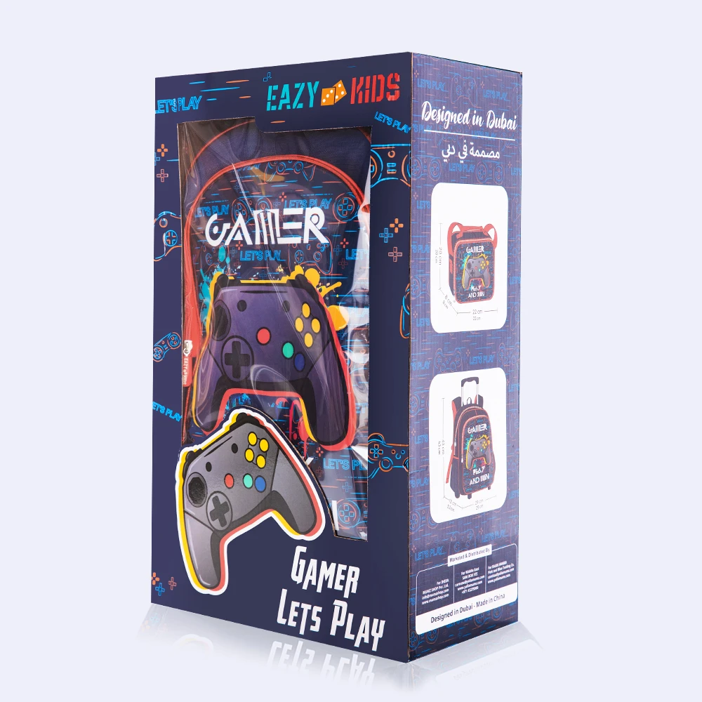 gamer design, blue school set, trolley backpack set, insulated lunch bag, lunch box included, water bottle included, pencil case included, school essentials kit, organized compartments, reflective safety strips, durable fabric, wipe clean material, ergonomic straps, matching school gear, bold school set, complete school kit, travel-ready set, novelty school collection, practical lunch gear, eazy kids school set