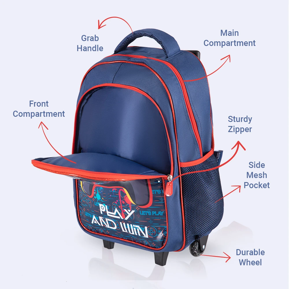 Eazy Kids 17‑Inch Set of 5 Trolley School Bag with Lunch Bag, Pencil Case, Lunch Box and Water Bottle - Gamer, Blue