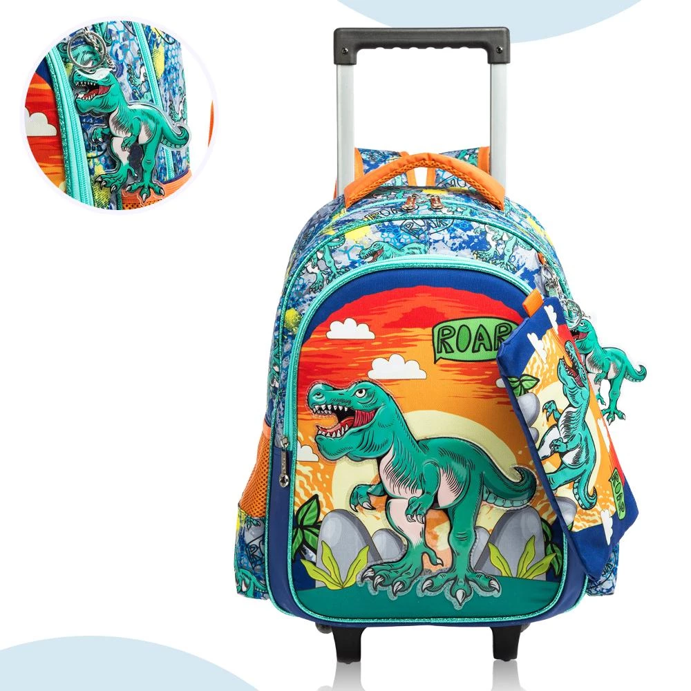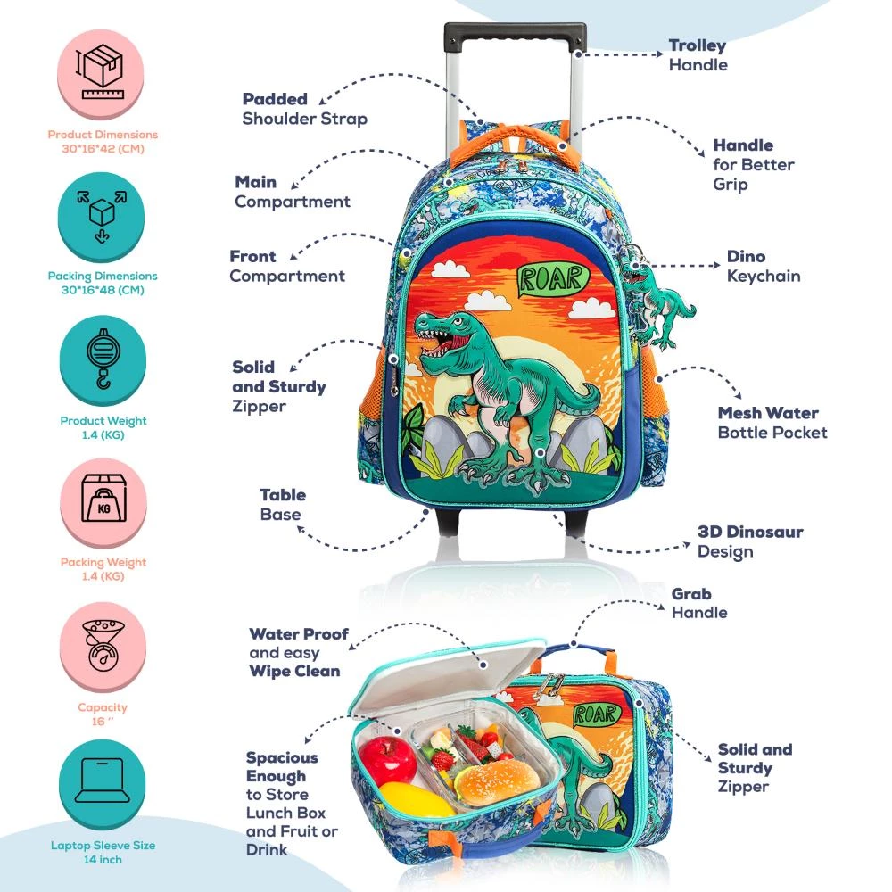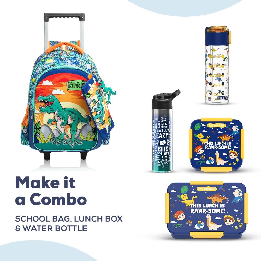 dinosaur trolley school bag, orange kids backpack set, boys school bag combo, rolling backpack with lunch bag, Eazy Kids school bags, stair-climbing school trolley, 3D dinosaur backpack, waterproof kids backpack, school essentials for boys, durable trolley school bag