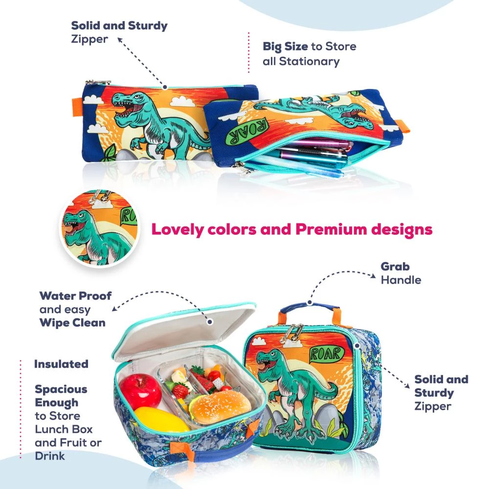 Power up your childs school routine with the Eazy Kids 3-in-1 Trolley School Bag Set in bold orange, featuring an eye-catching 3D dinosaur design. This functional set includes a spacious trolley backpack, a matching insulated lunch bag, and a pencil caseall crafted for convenience and durability. The trolley bag features smooth-glide wheels, a stair-climbing design, and an anti-skid lock that can handle up to 50 kg of load. Water-resistant and reinforced with safety light-reflective strips, this set keeps kids both stylish and safe. Multiple zip compartments, side mesh pockets, and a strong polyester exterior make it easy to organize books, gadgets, and daily school gear. With soft padded shoulder straps and a contoured back panel, comfort meets performance in this versatile back-to-school essential.