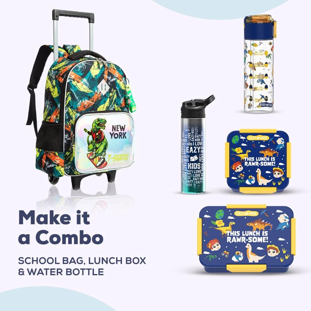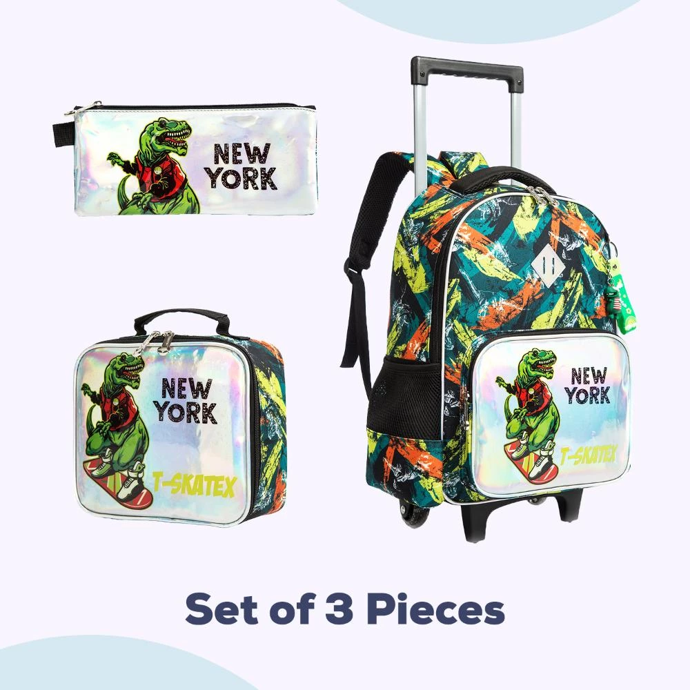 new york dinosaur trolley bag, green school bag set for boys, 3-in-1 kids school bag, dinosaur rolling backpack, Eazy Kids boys combo, waterproof school bag set, stair-safe trolley backpack, premium boys school bag, kids school luggage set, safety reflective school bag