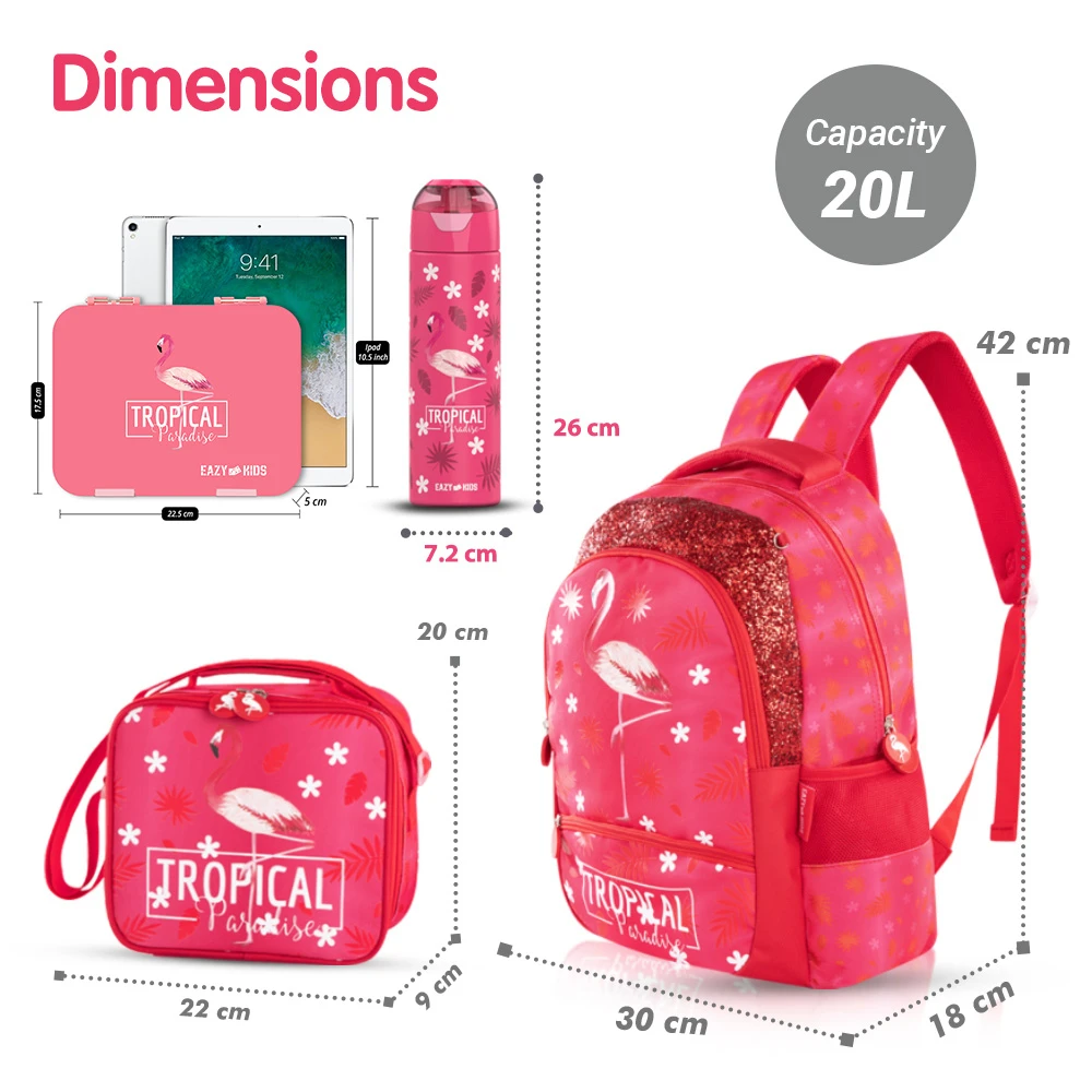 school bag set, tropical pink design, 17 inch school bag, stainless steel water bottle, 640ml bottle, bento lunch box, leak proof lunch box, insulated lunch bag, matching pencil case, durable school gear, organized school set, multi compartment bag, stylish school accessories, novelty school design, travel friendly school bag, coordinated school set, easy clean school gear, premium school set, fashionable school set