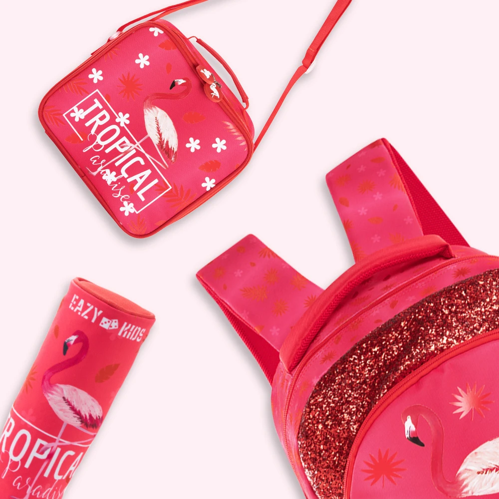 school bag set, tropical pink school bag, 17 inch school bag, stainless steel water bottle, 640ml water bottle, insulated lunch bag, matching pencil case, durable school set, multi compartment school bag, girls school gear, back to school kit, kids backpack set, lunch bag combo, hydration bottle for kids, stylish school bag, reusable water bottle, lightweight school bag, organized school kit, cute school accessories, coordinated school set