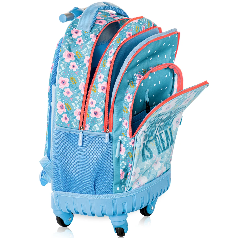 eazy kids school set, flora trolley backpack, floral school bag, kids trolley set with lunch bag, girls school supplies, 18 inch trolley backpack, floral print backpack, insulated lunch bag for girls, 4-wheel school bag, kids backpack set, stylish school set, pencil case for school, rolling backpack for girls, school bag with wheels, kids floral backpack, school essentials for girls, lightweight trolley bag, school gear set, back to school set, nature themed backpack