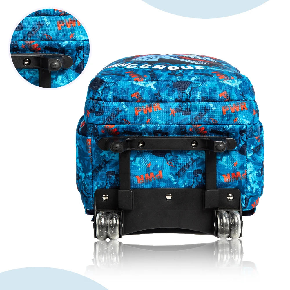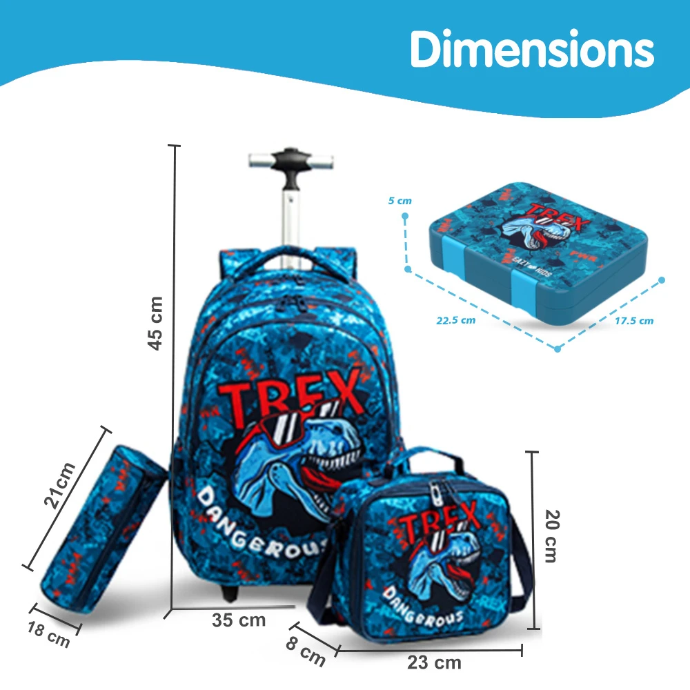 trolley school bag set, trex dinosaur design, blue school bag, 18 inch trolley bag, bento lunch box, leak proof lunch box, insulated lunch bag, matching pencil case, smooth rolling wheels, adjustable trolley handle, durable school set, organized school gear, kids school accessories, multi compartment bag, stylish school set, novelty school design, travel friendly school bag, coordinated school set, easy clean school bag, practical school gear