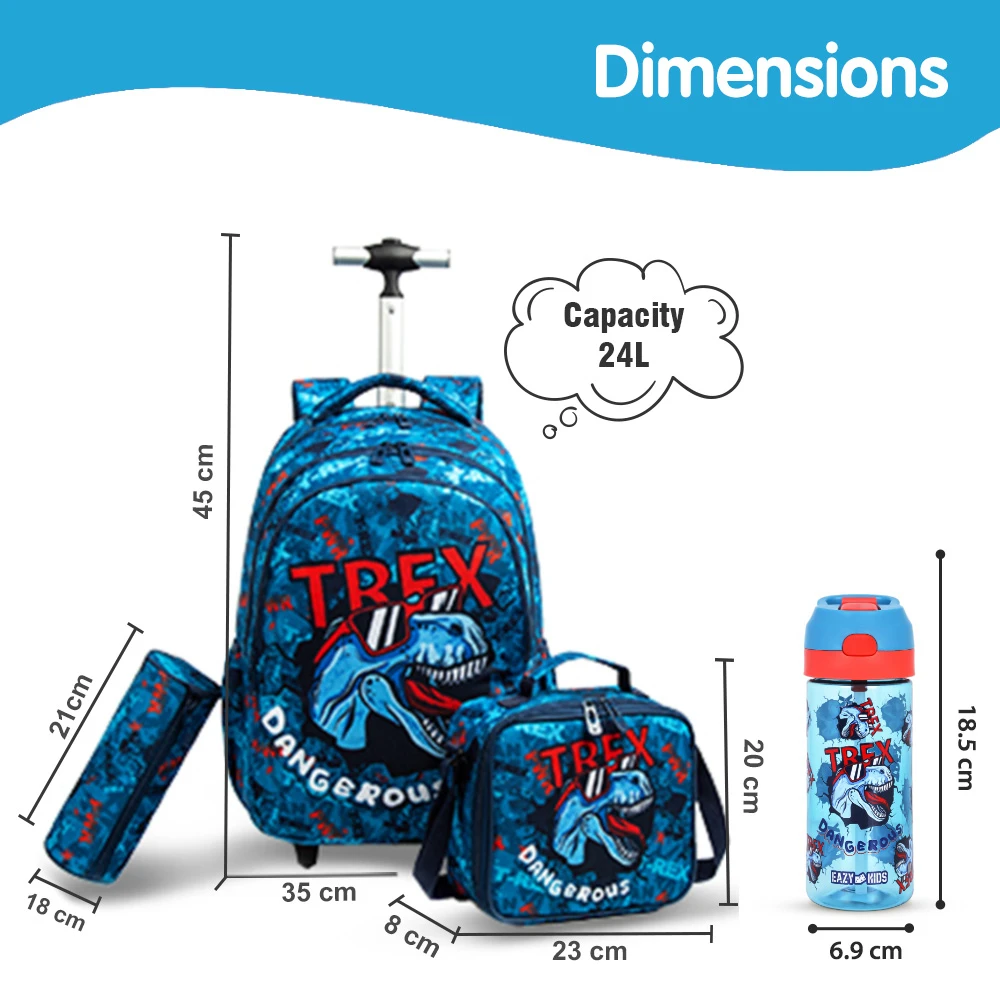 Eazy Kids 18Inch Set of 4 Trolley School Bag with Tritan 420ml Water Bottle, Lunch Bag and Pencil Case - TREX Dinosaur - Blue