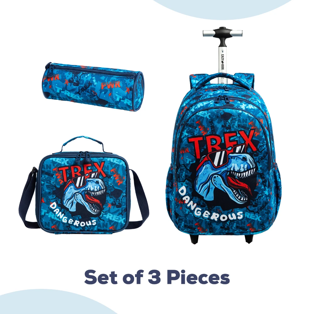 Eazy Kids 18Inch Set of 5 Trolley School Bag with Bento Lunch Box, Stainless Steel 640ml Water Bottle, Lunch Bag and Pencil Case - TREX Dinosaur - Blue