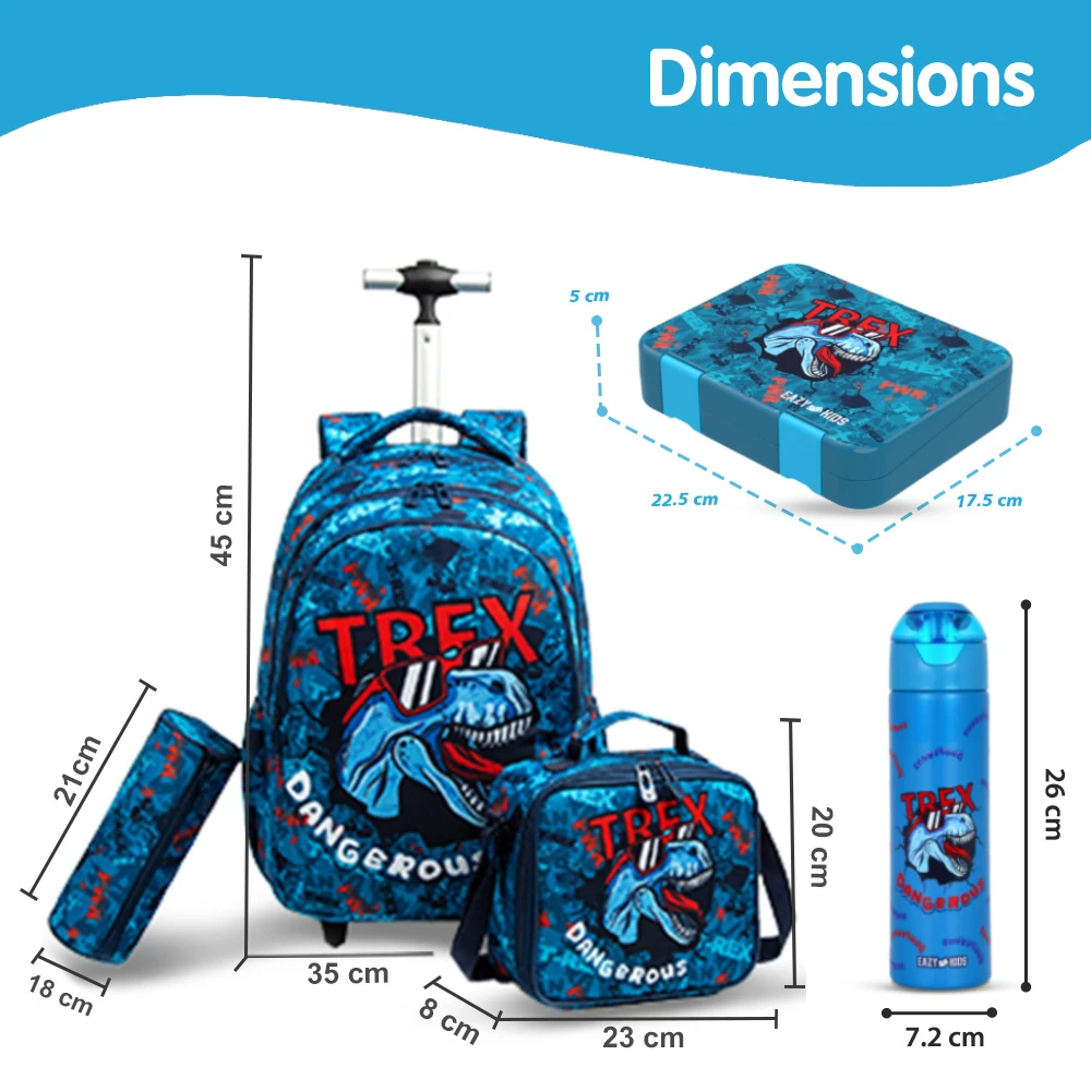 trolley school bag set, trex dinosaur design, blue school bag, 18 inch trolley bag, stainless steel water bottle, 640ml bottle, bento lunch box, leak proof lunch box, insulated lunch bag, matching pencil case, smooth rolling wheels, adjustable trolley handle, durable school set, organized school gear, kids school accessories, multi compartment bag, stylish school set, novelty school design, travel friendly school bag, coordinated school set