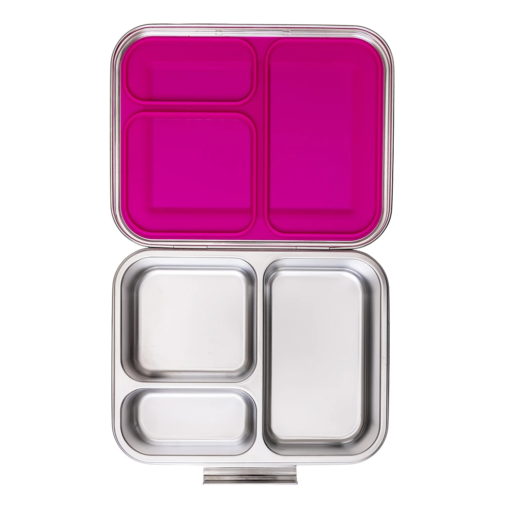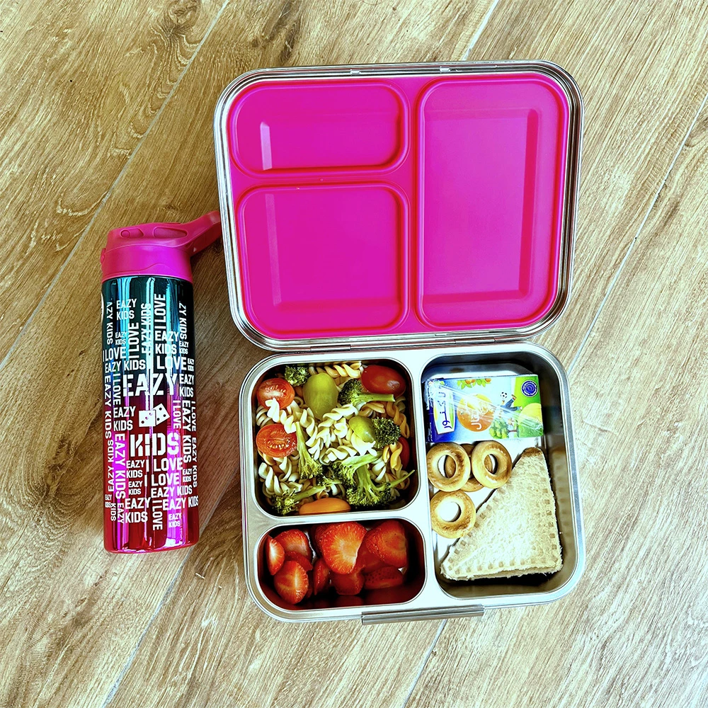 Bring vibrant style and functionality to meals with this pink stainless steel bento lunch box from Eazy Kids. Featuring three compartments to separate food, snacks, and sauces, it's crafted from high-quality stainless steel and backed by BPA-free, safe materials. The silicone-lined seal lid provides leak-resistant performance even with saucy items. Its slanted-lid opening enhances usability for small hands, and the removable inner tray is easy to clean. Safe for dishwasher top rack and microwave use with the inner tray, this lunch box delivers practical and appealing packed meal storage every day.