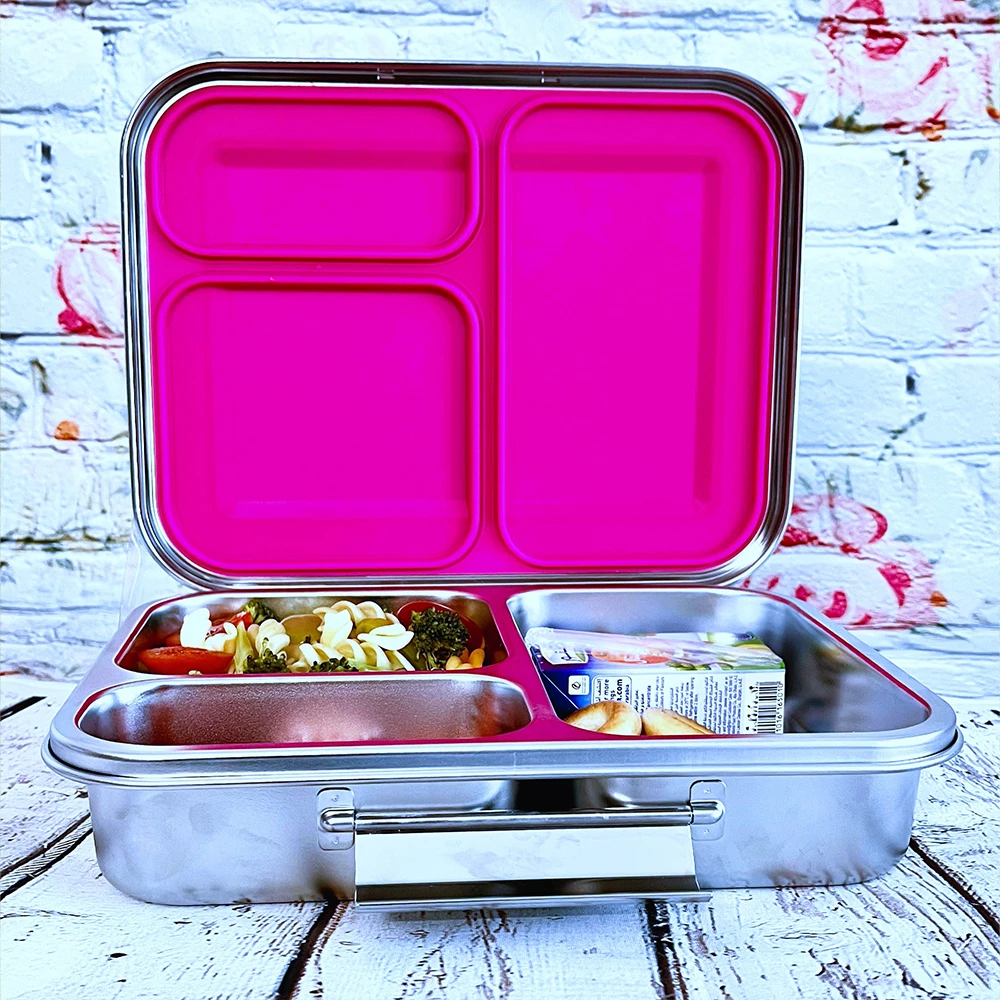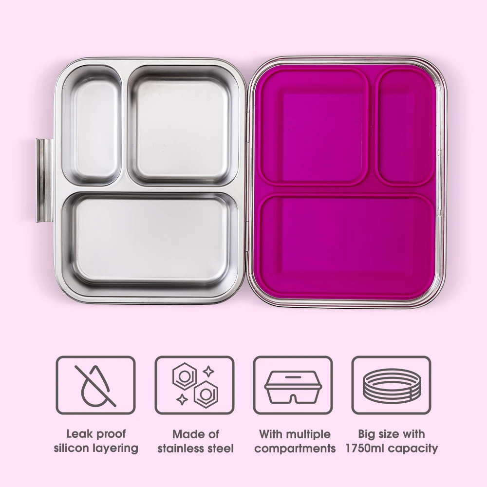 steel bento box, 3 compartment lunch box, pink lunch box, stainless steel container, silicone seal lid, leakproof lunch box, organized food box, eco friendly lunch box, reusable lunch box, easy open lid, dishwasher safe, microwave tray safe, school meal box, travel lunch box, food separation lunch box, spill resistant, compact design, durable lunch box, stylish pink box, convenient meal box