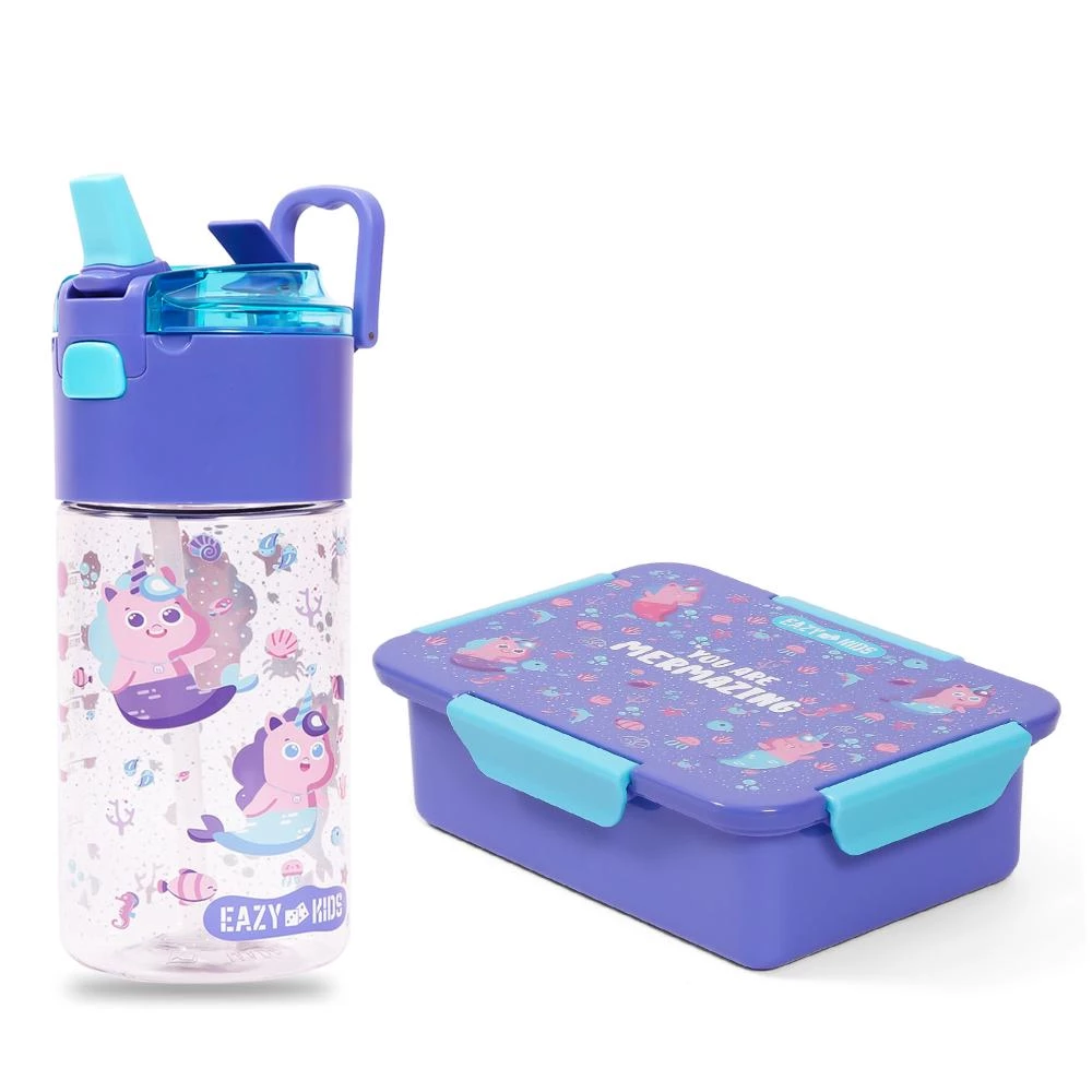 mermaid lunch bag combo, purple insulated lunch bag, kids lunch box with water bottle, BPA free school lunch set, leakproof lunch box for girls, Eazy Kids mermaid set, Tritan bottle for kids, dual compartment lunch bag, school lunch essentials, stylish lunch kit for girls