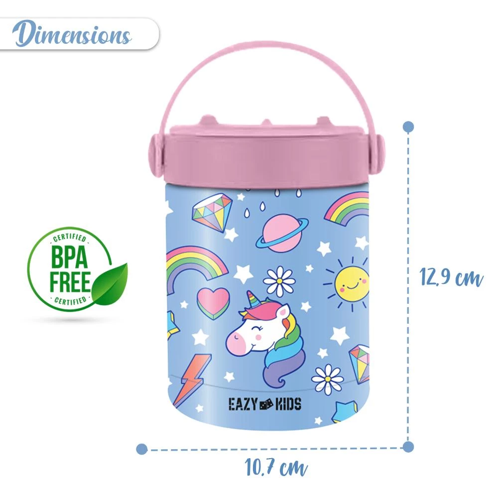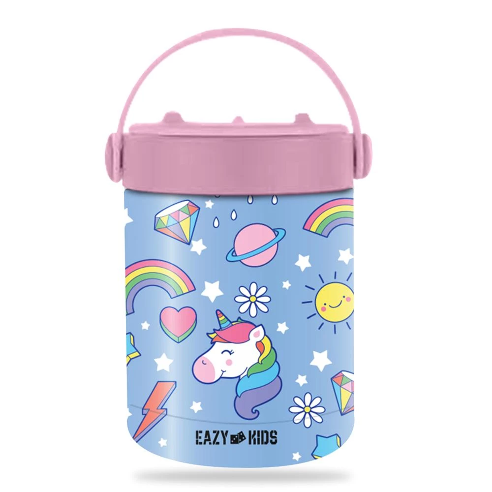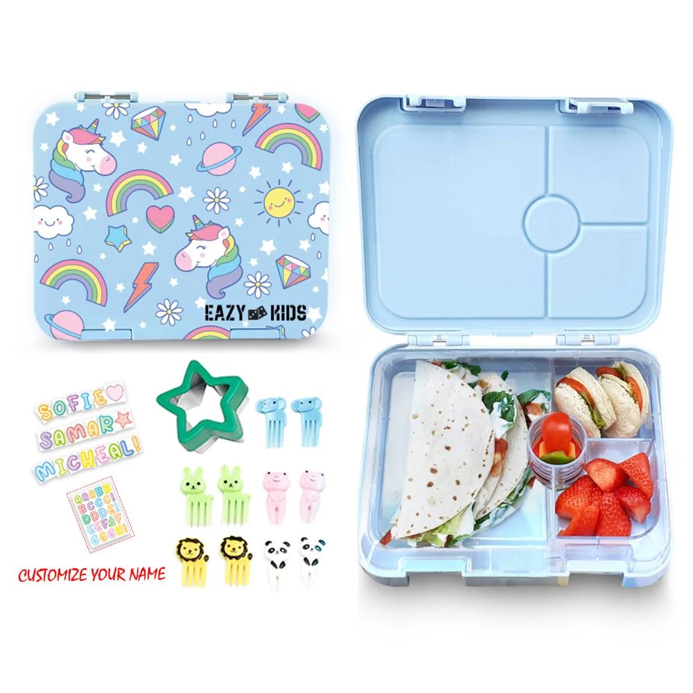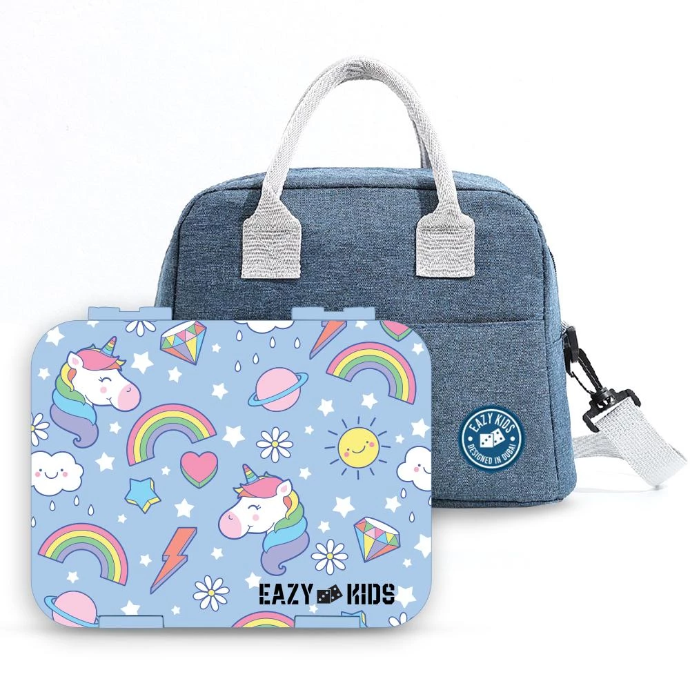 Eazy Kids 4 Compartment Bento Lunch Box with Lunch Bag and Steel Food Jar – Unicorn Blue