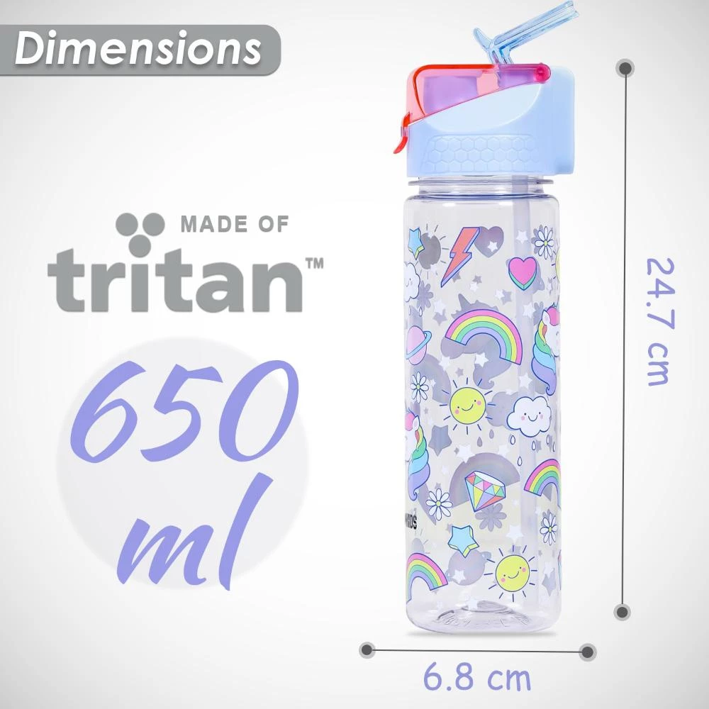 Upgrade your child's mealtime experience with the Eazy Kids Unicorn Lunch Box Combo featuring a 4-compartment bento box, a Tritan water bottle, and an insulated stainless steel food jar—all in a charming matching unicorn print. The bento box is crafted from BPA- and BPS-free Tritan material with a slanted mouth opening for easy access. Each of its four compartments is lined with a leakproof silicone seal, ideal for thick yoghurts and sauces. The removable top silicone tray ensures easy cleaning, and it’s dishwasher and microwave safe (tray only). The included food jar, made of double-wall 304 stainless steel, keeps meals warm for up to 6–8 hours and cold for around 10 hours. It includes a foldable spoon in the handle lid and is also freezer and dishwasher safe (top rack, without lid). Paired with a 2-in-1 flip lid Tritan water bottle, this combo is lightweight and perfect for school or travel. Bonus sandwich cutter and fruit picks are included for fun mealtime creativity. All items are made from non-toxic, food-grade, eco-friendly materials.