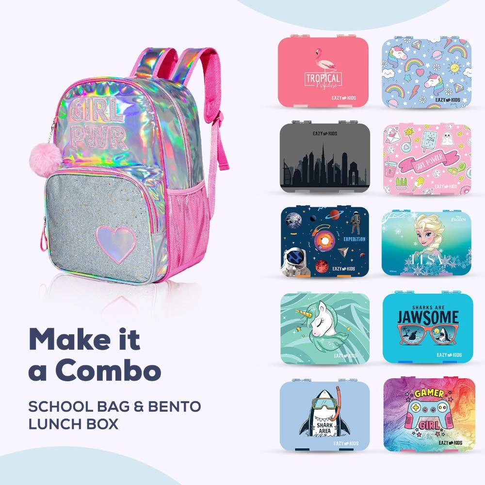 Empower your little one with the Eazy Kids 4-in-1 Back to School Combo in the vibrant “Girl Power” pink edition. Featuring coordinated prints and color themes, this stylish combo includes a spacious school bag, insulated lunch bag, matching pencil case, and an advanced leakproof bento lunch box made from BPA-free Tritan™. The high-quality polyester school bag offers padded, adjustable shoulder straps and multiple compartments for hassle-free organization. Its water-resistant build, sturdy zippers, and trolley strap make it ideal for daily school commutes and activities. The bento-style lunch box redefines lunchtime convenience. With a slant mouth opening and removable divider, it adjusts between 5 and 4 compartments to suit a variety of meal types. A silicon-sealed top layer ensures a secure, leakproof fit—perfect for thick yogurts, dips, and dressings. It's microwave safe (inner tray), dishwasher friendly, and includes bonus accessories like a sandwich cutter, fruit picks, and fun alphabet stickers to inspire creative eating. Complete with a matching lunch bag and pencil pouch, this combo is the ultimate choice for kids ready to take on the school year in style.