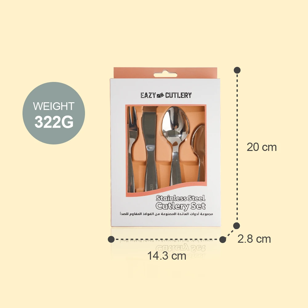The Eazy Kids set of 4 cutlery in grey offers a complete mealtime solution in a sleek and modern design. Featuring a spoon, fork, knife, and tea spoon, this set is perfect for daily use whether at school, home, or on the go. Each piece is crafted from durable, food-grade stainless steel to ensure longevity and safety, while the smooth edges provide a comfortable dining experience.