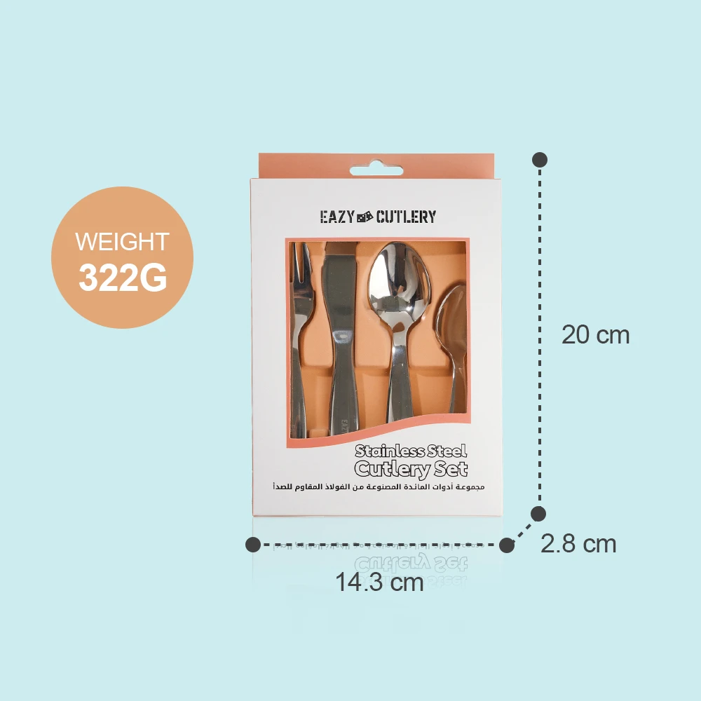 The Eazy Kids ivory cutlery set combines practicality with timeless elegance. This 4-piece set includes a spoon, fork, knife, and tea spoon, all made from high-quality, food-safe stainless steel for durability and easy cleaning. The utensils are perfectly balanced and feature smooth finishes for safe and comfortable handling during meals.