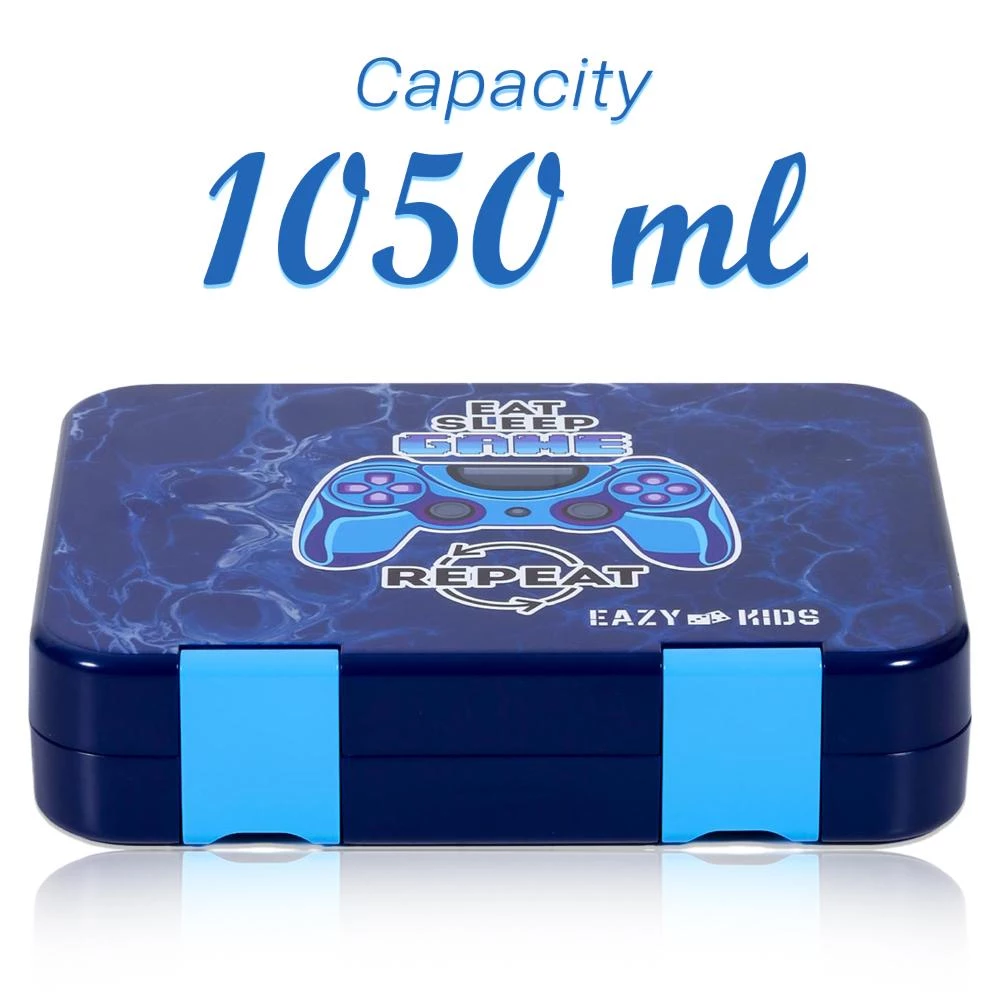 eazy kids bento lunch box, eat sleep game lunch box, gamer kids lunch box, convertible bento box, bpa free kids lunch box, leakproof school lunch box, lunch box with sandwich cutter, kids lunch box with fruit picks, tritan bento lunch box, fun kids lunch box