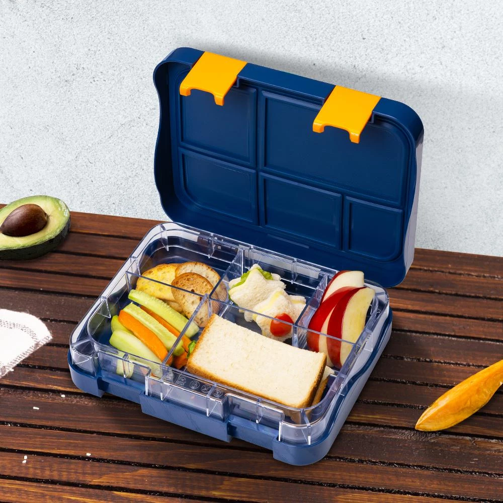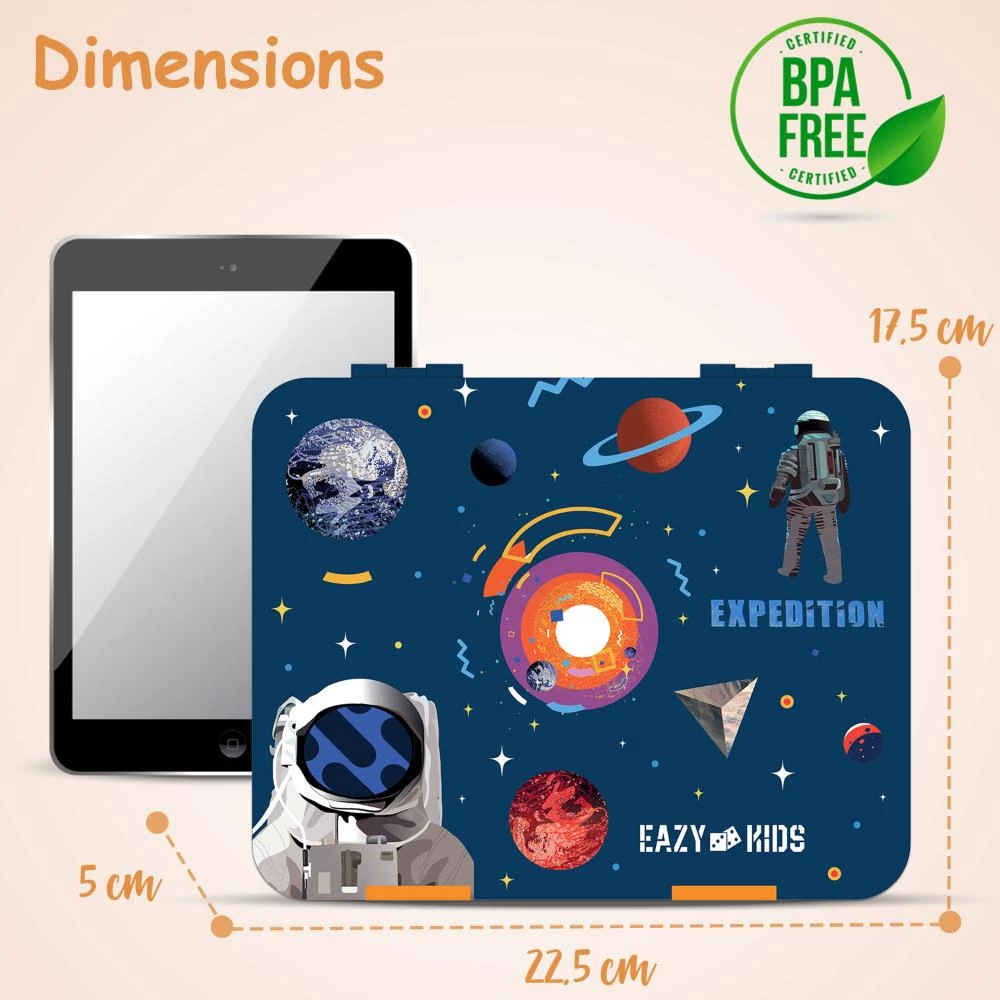 Blast off to fun lunchtimes with the Eazy Kids 5 & 4 Convertible Bento Lunch Box - Expedition Space! This cleverly designed bento box is perfect for kids who love adventure. Easily convert between five and four compartments with the removable divider to pack healthy meals, snacks, sauces, or yogurt. Made of tough Tritan, a BPA and BPS-free material, its durable, leakproof and built for daily use. The unique slant mouth opening provides easy access for little hands, while the silicon-lined top layer keeps each section sealed tight to prevent spills. The removable top tray makes cleaning simple, and the inner tray is microwave and dishwasher safe. A fun sandwich cutter, animal-shaped fruit picks, and alphabet stickers are included to make every lunch an out-of-this-world experience! Compact to fit all standard lunch bags, this is your go-to choice for a stress-free back-to-school meal plan.
