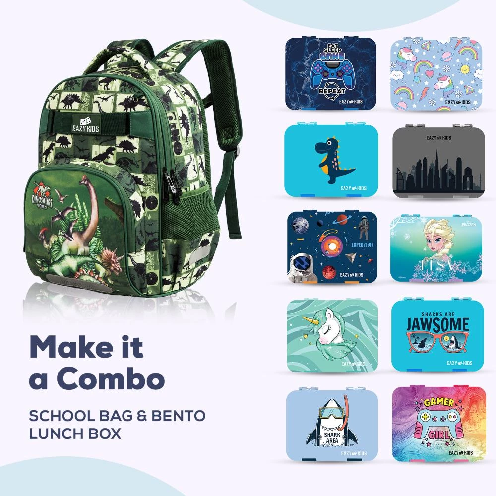 dinosaur school bag combo, kids back to school set, Eazy Kids 5-in-1 combo, black green backpack set, leakproof lunch box for kids, tritan water bottle school, insulated lunch bag kids, eco-friendly school combo, boys backpack with accessories, kids dinosaur print bag