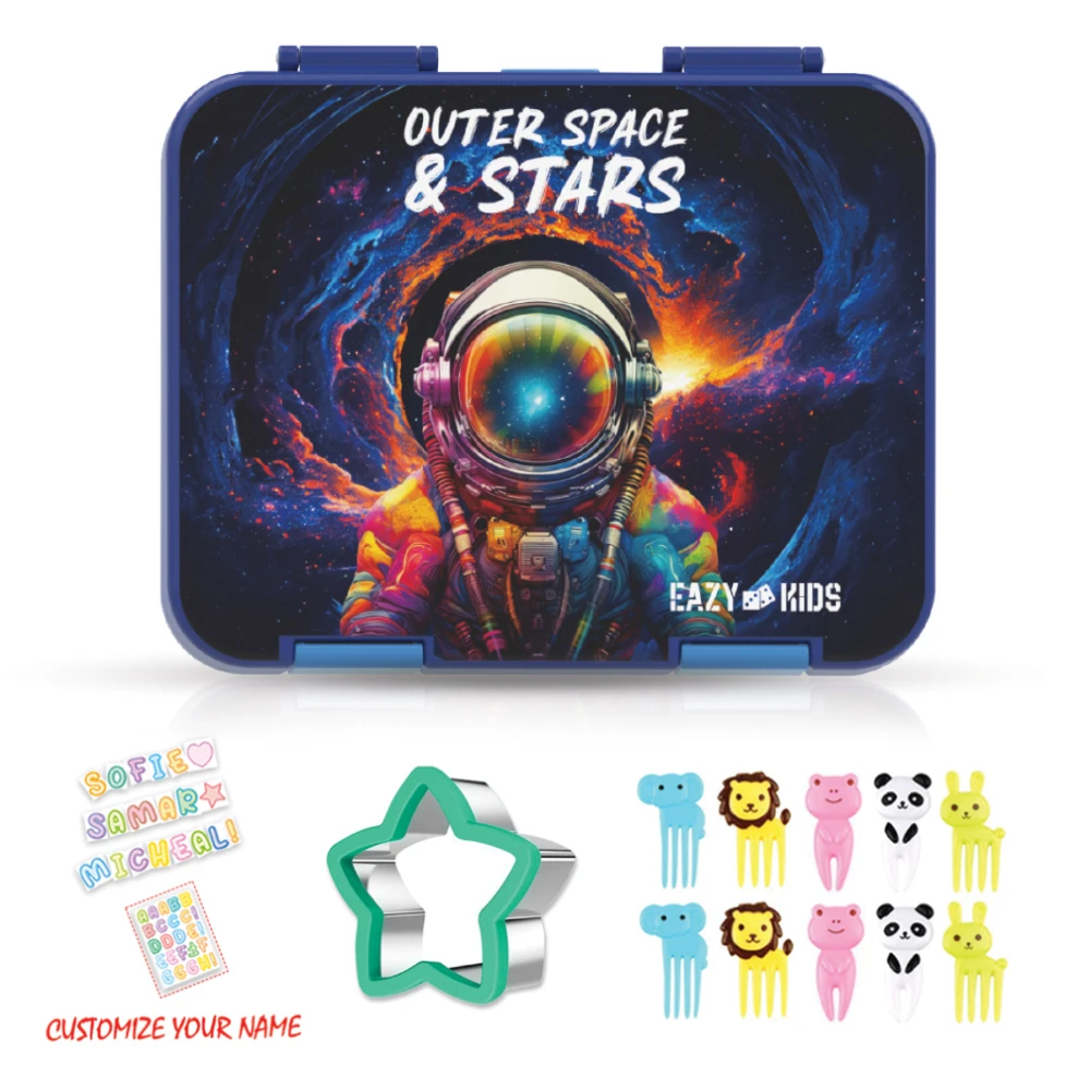 bento lunch box, convertible lunch box, outer space design lunch set, blue lunch box, leak proof lunch box, insulated lunch bag, sandwich cutter set, fun lunch accessories, kids meal prep, eazy kids lunch set, safe lunch box, durable lunch gear, reusable lunch box, novelty lunch set, travel lunch set, stylish lunch kit, organized lunch storage, easy clean lunch box