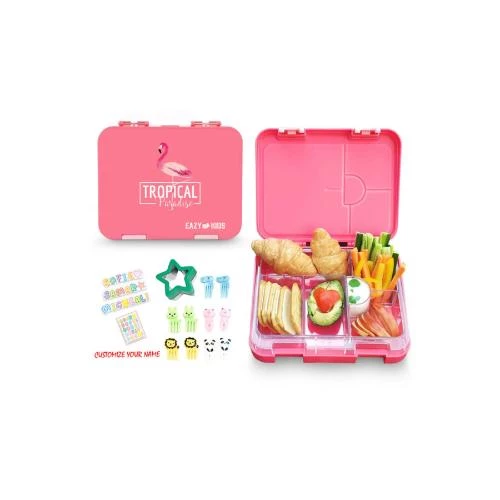 eazy kids bento box, convertible lunch box, flamingo pink lunch box, bpa free lunch box, bps free lunch box, tritan lunch box, kids lunch box with compartments, leakproof bento box, kids sandwich cutters, animal fruit picks, dishwasher safe lunch box, microwave safe lunch box