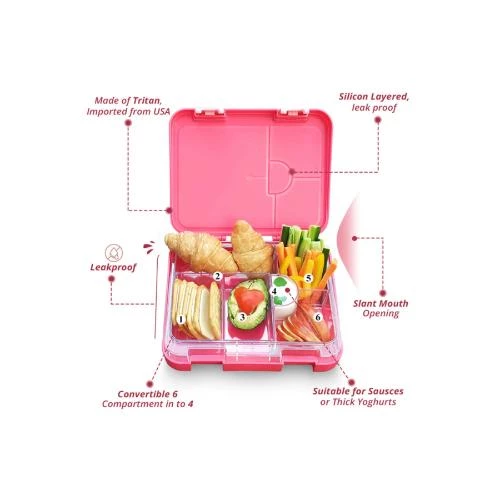 Make mealtime exciting and nutritious with the Eazy Kids 6 & 4 Convertible Bento Lunch Box in Flamingo Pink, crafted from Tritan, a BPA and BPS-free revolutionary material that ensures safety and durability. This versatile lunch box features a removable two-part tray that allows easy conversion between 6 and 4 compartments for perfectly portioned meals. The unique slant mouth opening offers easy access to food, and each compartment is sealed with a removable silicon layer that is completely leakproof-ideal for sauces and thick yogurts. Cleaning is hassle-free with the dishwasher-safe (top rack) and microwave-safe (inner tray) design. The lunch box comes with a set of sandwich cutters and 10 fun animal-shaped fruit picks, turning every meal into an engaging experience. Compact and easy to carry, it fits perfectly in standard lunch bags, making it ideal for school or outings.