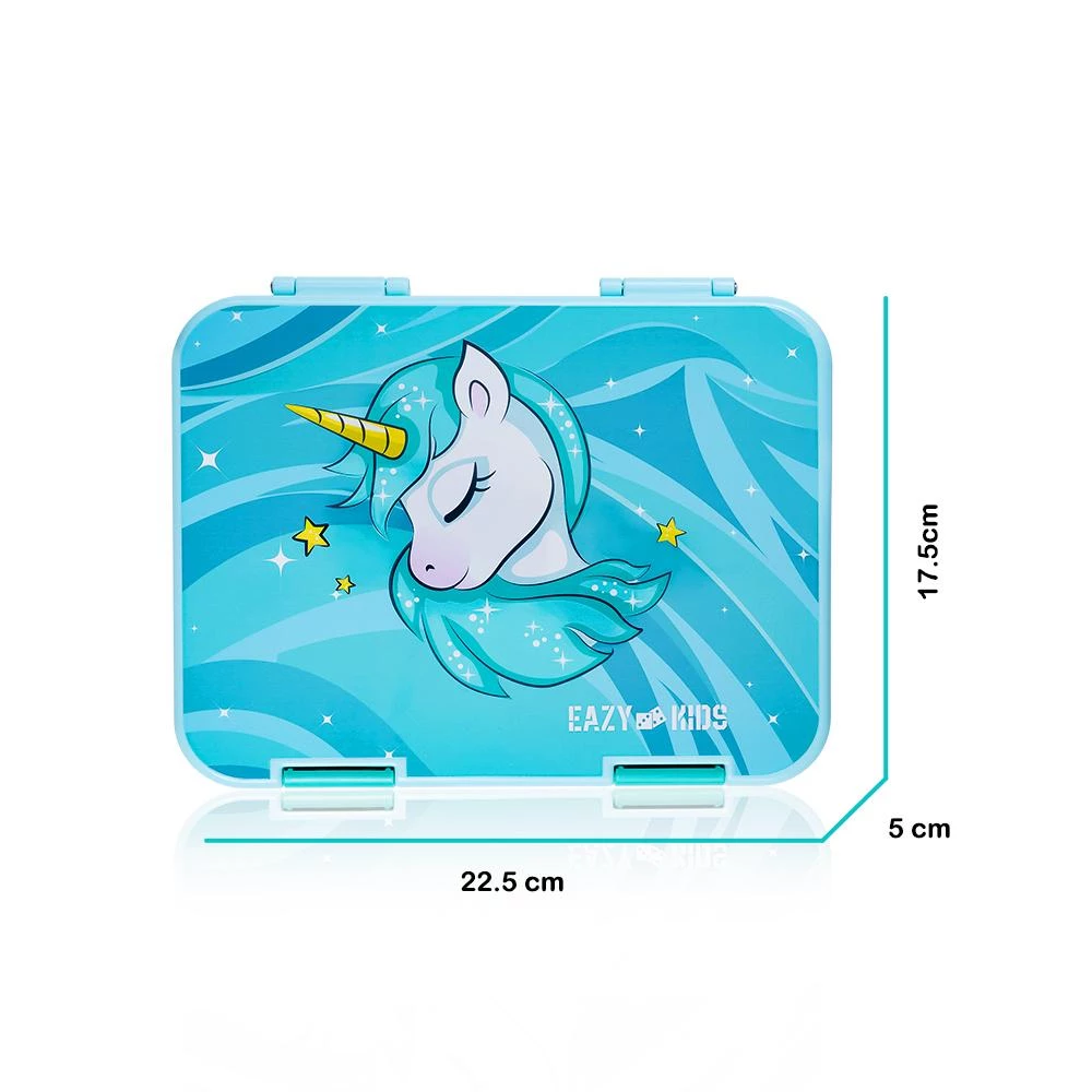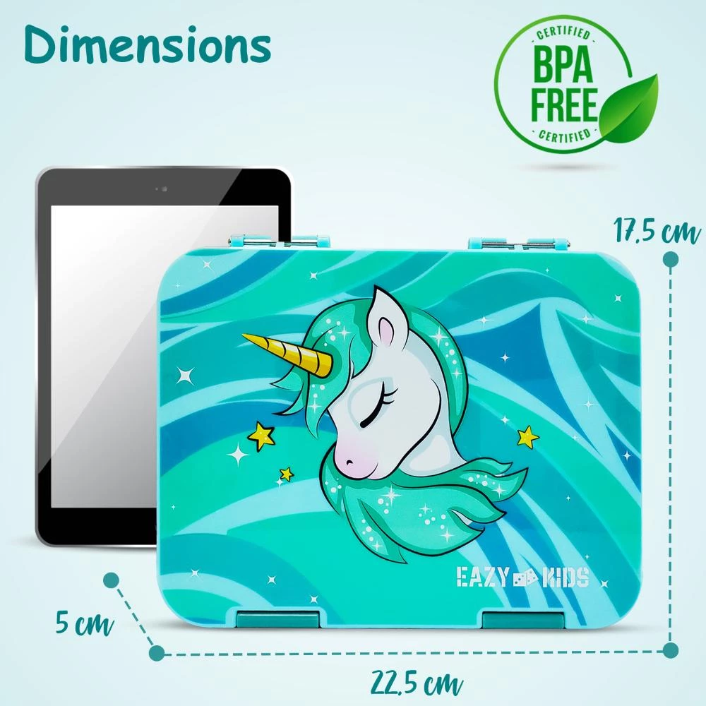 eazy kids bento lunch box, unicorn bento box, kids lunch box with sandwich cutter, leakproof kids lunch box, bpa free bento box, convertible bento box, green kids lunch box, lunch box with fruit picks, tritan lunch box for kids, fun kids lunch box