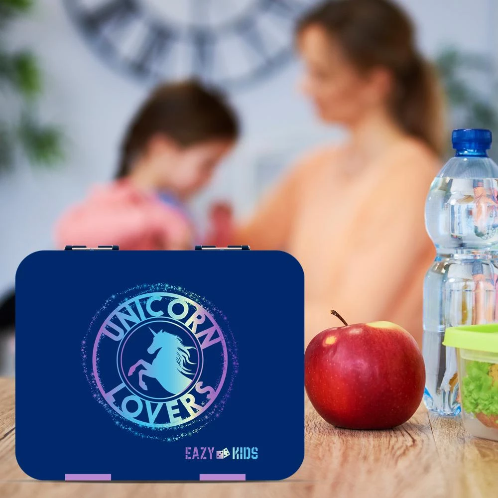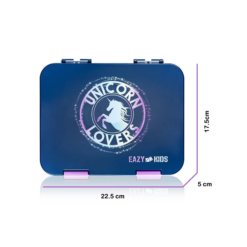 eazy kids bento lunch box, unicorn lunch box blue, convertible kids bento box, leakproof kids lunch box, bpa free lunch box, kids lunch box with sandwich cutter, tritan kids lunch box, lunch box with fruit picks, unicorn lover lunch box, kids school lunch box