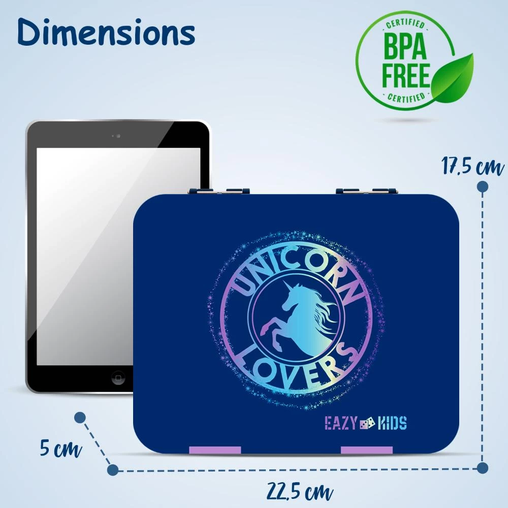 Transform your childs lunch into a fun and nutritious experience with the Eazy Kids 6 & 4 Convertible Bento Lunch Box with Sandwich Cutter Set in Unicorn Lover Blue. This smart bento box design gives you the freedom to adjust between six or four compartments using the removable tray, so you can pack a mix of dry and saucy dishes worry-free. The top layer is lined with a silicon seal that keeps each section leakproof and fresh until lunchtime. Made from sturdy Tritan material thats completely BPA and BPS-free, this bento lunch box is safe for daily use and easy to clean thanks to its removable trays and dishwasher-safe parts. The playful slant mouth opening provides easy access for little hands. To make meals more enjoyable, this set includes a sandwich cutter, ten adorable animal-shaped fruit picks, and alphabet stickers to decorate your childs lunch. Compact, stylish, and practical, the Unicorn Lover Blue bento lunch box is perfect for back to school or family outings.