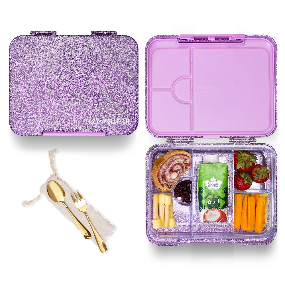 convertible bento box, glitter purple lunch box, 6 compartment bento, 4 compartment bento, leakproof lunch box, pp lunch box, customizable compartments, meal prep container, silicone seal lid, microwave safe tray, dishwasher safe, eco friendly lunch box, sparkle design, kids lunch box, reusable container, meal organization, school lunchbox, travel lunch solution, fun lunch gear