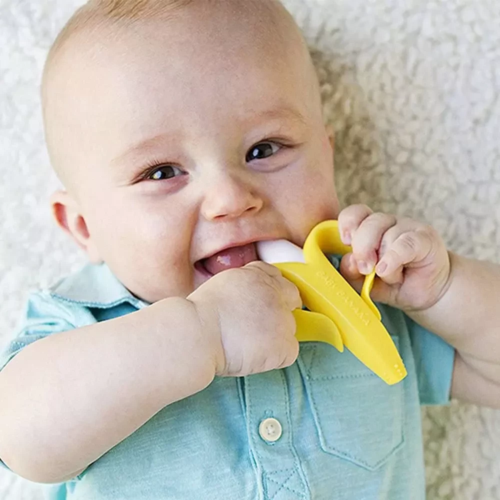 baby banana toothbrush, silicone baby teether, teether and toothbrush combo, infant oral care, yellow baby toothbrush, Eazy Kids teether, BPA free baby toothbrush, food grade silicone teether, freezer safe teether, soft bristle infant brush