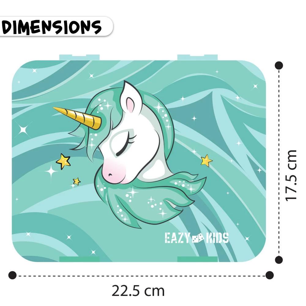 unicorn kids bento lunch box, bento box with sandwich cutter set, Eazy Kids unicorn bento combo, insulated lunch bag for kids, tritan bento box kids, convertible compartments bento box, BPA free kids lunch box, leakproof kids bento box, back to school lunch set, lunch box with fruit picks