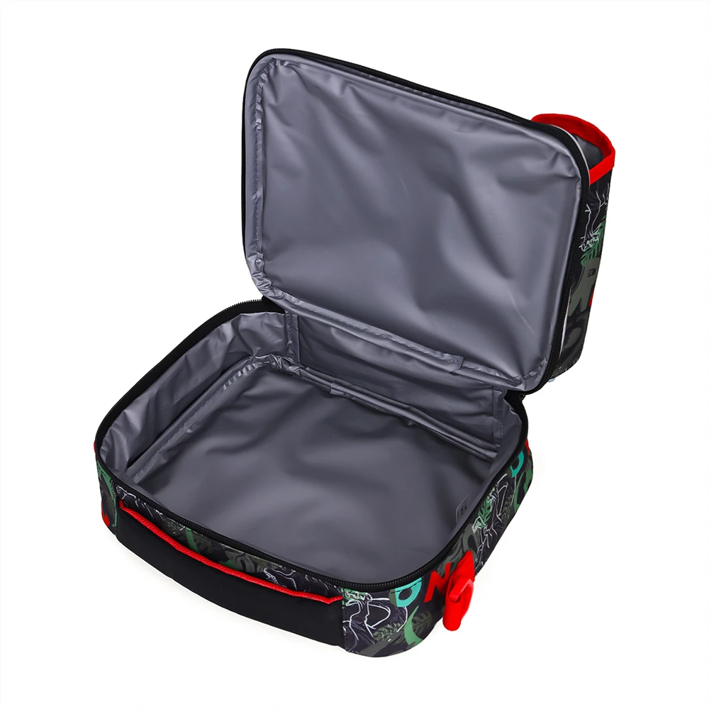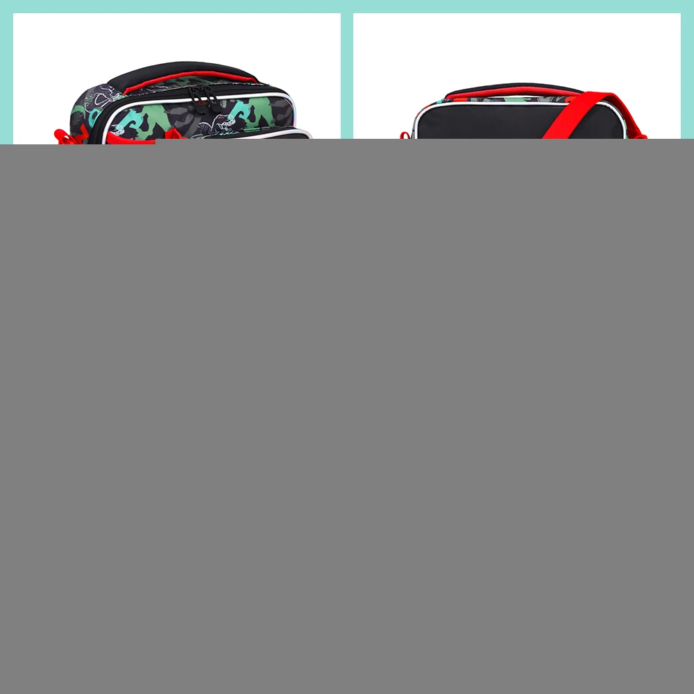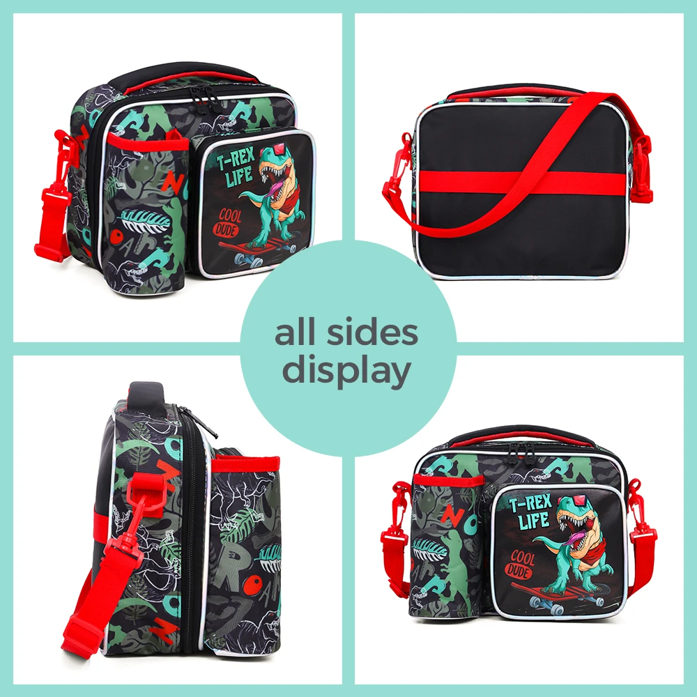 bottle lunch bag, dinosaur design, green lunch bag, insulated lunch bag, dirt-proof material, easy clean, adjustable shoulder strap, detachable strap, stroller strap included, organized compartments, water-resistant lining, durable seams, leak-proof lunch tote, school meal bag, travel lunch accessory, fun lunch bag, kids lunch organizer, practical design, novelty lunch bag, eazy kids bag