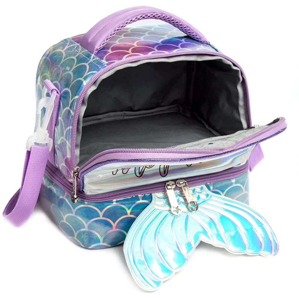 lunch bag for kids, insulated lunch bag, mermaid lunch bag, dual compartment lunch tote, bottle and food bag, school lunch bag, thermal lunchbox carrier, water-resistant lunch bag, stylish lunch bag, purple mermaid bag